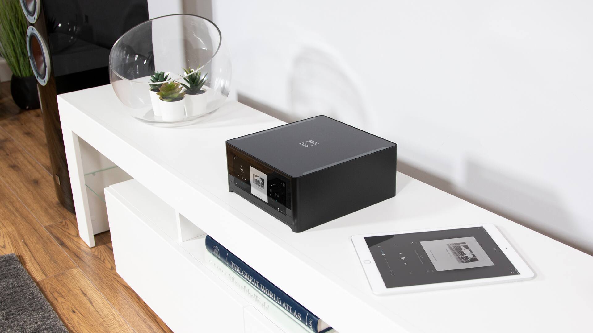 Clear interface, easy controls, solid sound performance. Easy to hook streaming services to.