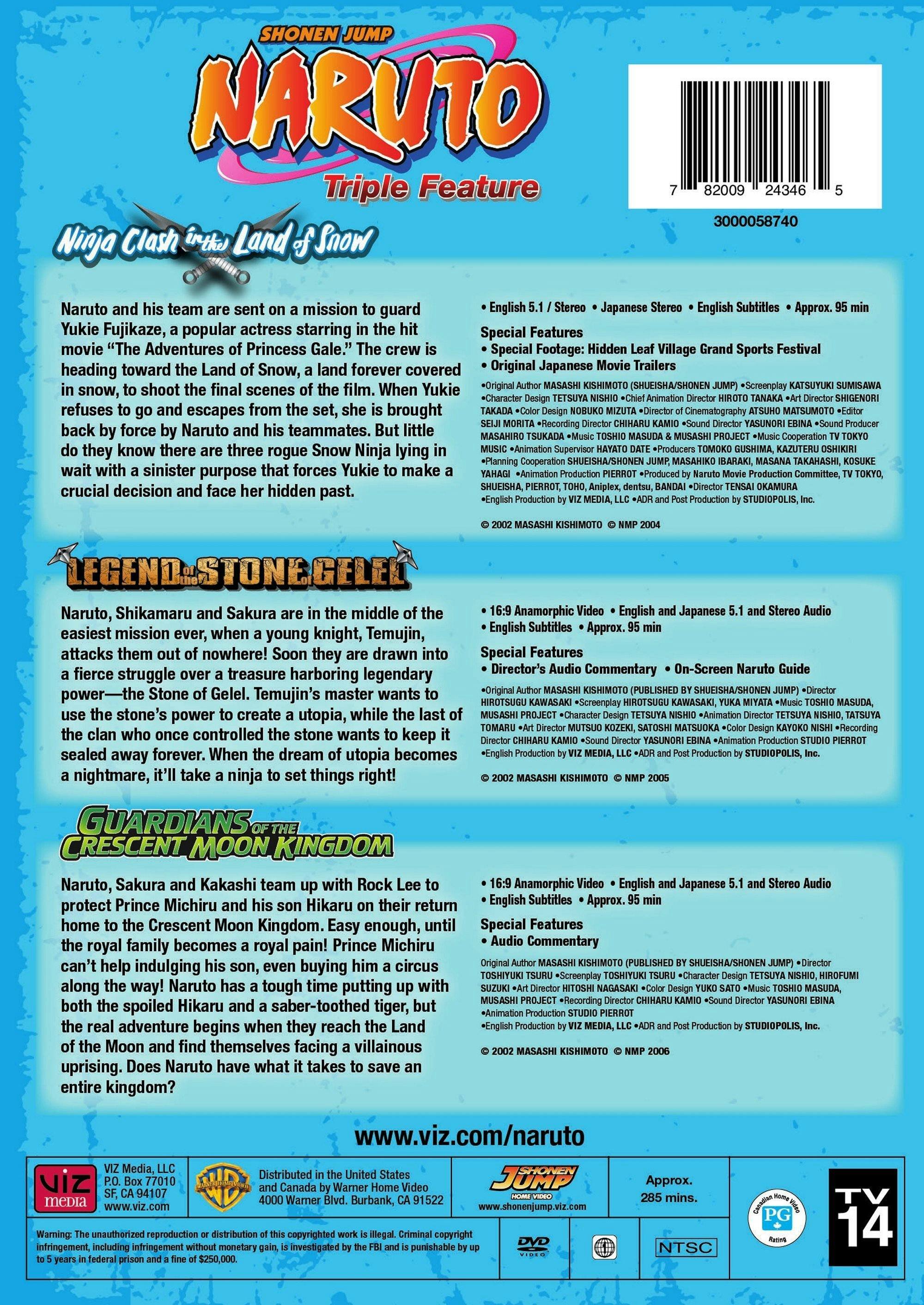 As a huge Naruto fan, I was pleased to see this package deal of 3 Naruto movies for 15 dollars. Five dollars per movie is a great price. I've since watched them all repeatly and basked in happy nostalgia of such an outstanding anime. I highly recommend this to any anime or Naruto fan. Great show! And amzing price!