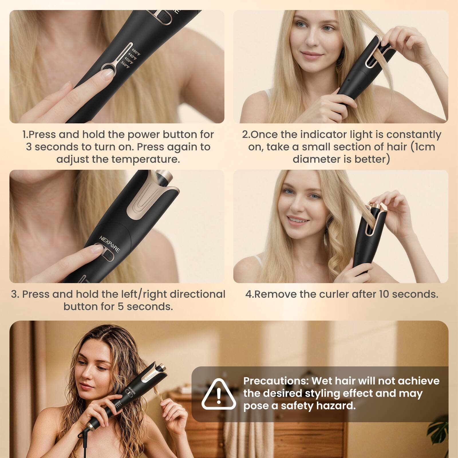 I like this automatic rotating curling iron, no burning risks, you need to try several times to get used to it! I tried 4 times and finally find how to use it! Really nice curl and long lasting curl if you use 360F!