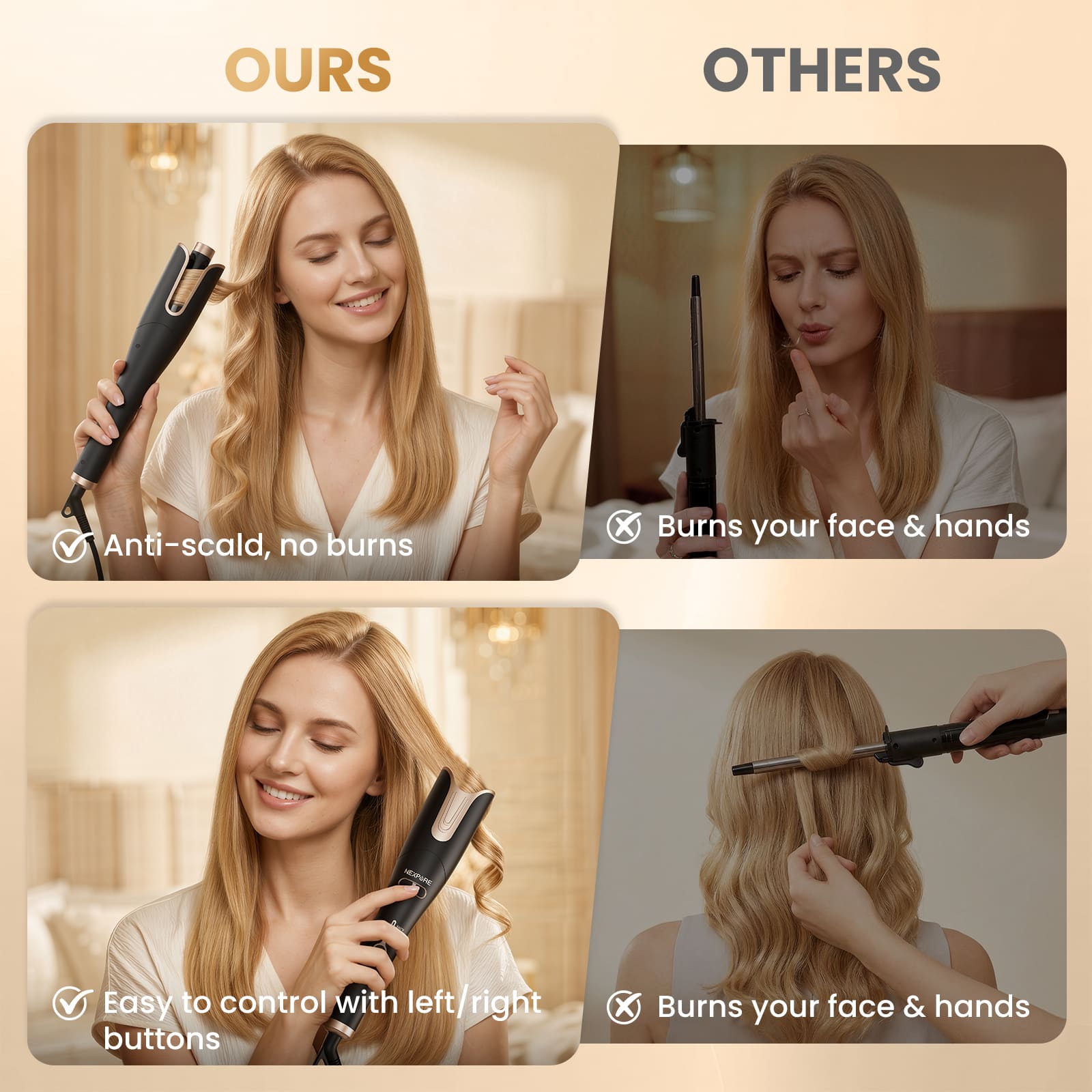I got burned easily with old styler hair curler so I really like this one, it is very easy and safe to maneuver for curly hair, I don’t need yo worry about getting hurt anymore. But it does take some time to make the whole hair with curls because I do have a lot of hair. In general, I am very happy with my purchase and like this product.
