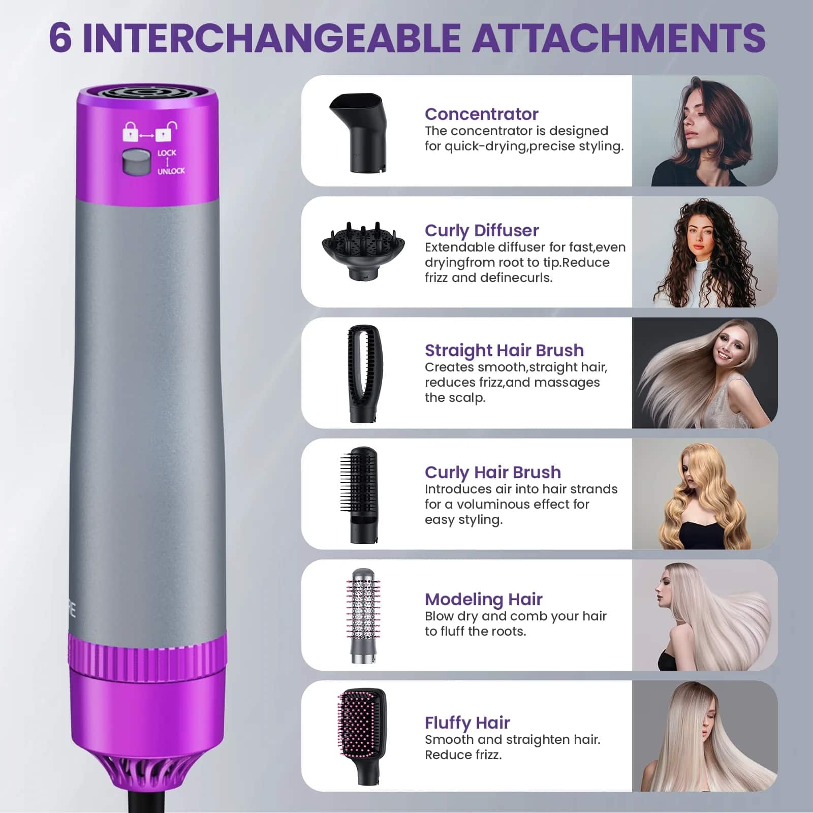 This tool is perfect! There are multiple attachments that change out quickly and easily. It makes drying and styling a breeze!