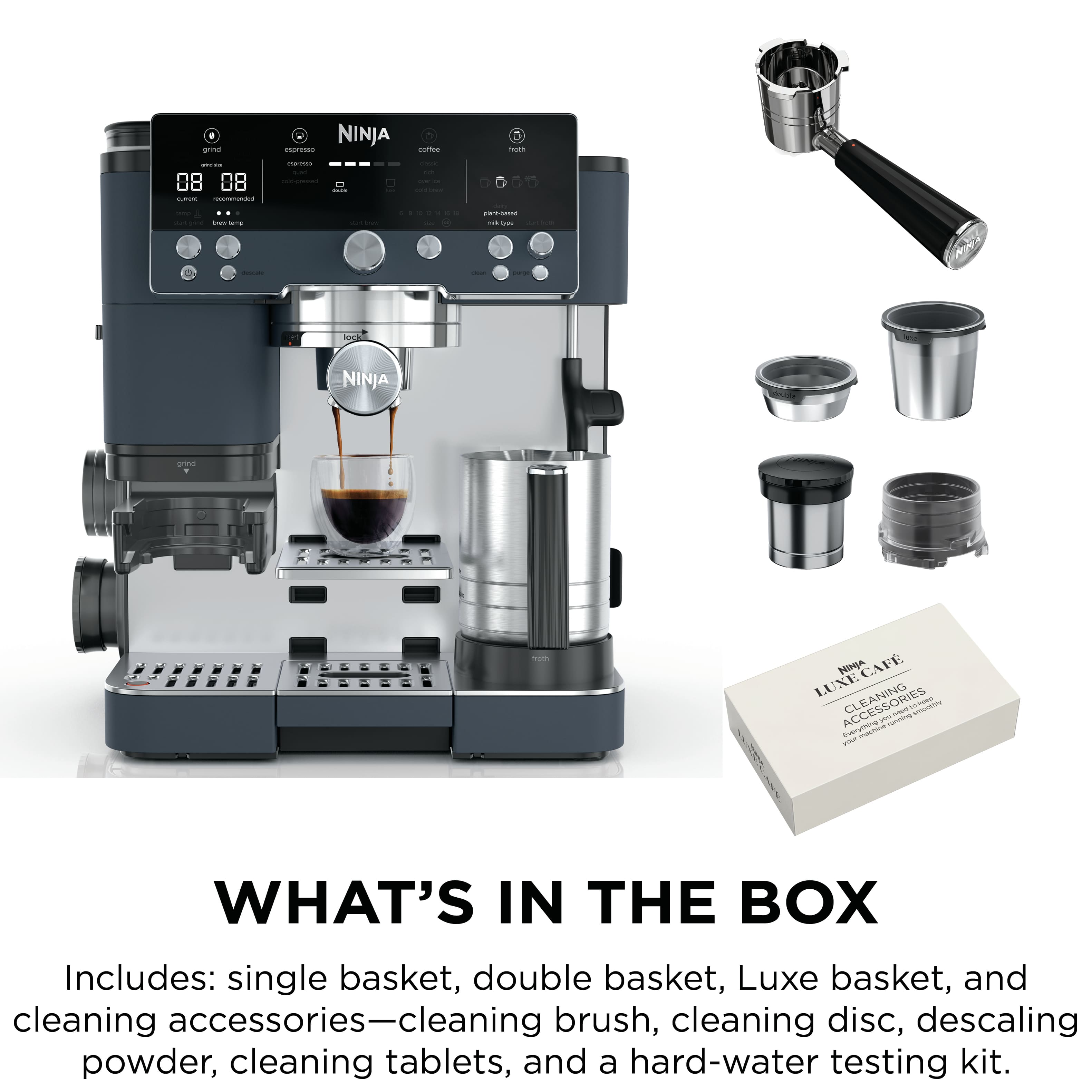 ||Posted . Owned for 7 months when reviewed.This reviewer received promo considerations or sweepstakes entry for writing a review.CUSTOMIZABLE DRINKS AT HOME!!! No more complicating your order at the coffee shop! It’s so easy to make hot or iced coffee drinks at home with this Ninjaluxe Espresso machine. It’s so amazing it takes out the guesswork of making espresso! Your machine will tell you exactly at what grind level to put it at based on freshness of espresso beans. Makes either a double shot or has the attachment for a QUAD shot. Yum!! Included in the box are the machine, attachments, descale tablets, user manual and a recipe book!