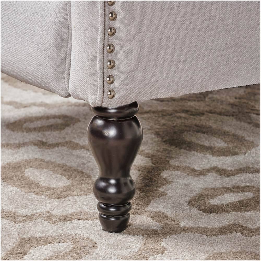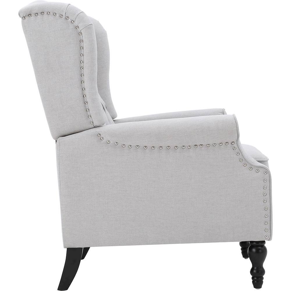 higher stars because the chair is easy to assemble and it actually reclines smoothly. The material is a really light grey and the texture reminded me of jeans. The legs are black and the studs are bright silver colored. All in all the chair seems cheap and very small/ narrow. Also, the back panel to the chair does not touch all the way to the arms.. if you look closely in the product picture you can see a gap on either side towers the back of the arm rest.