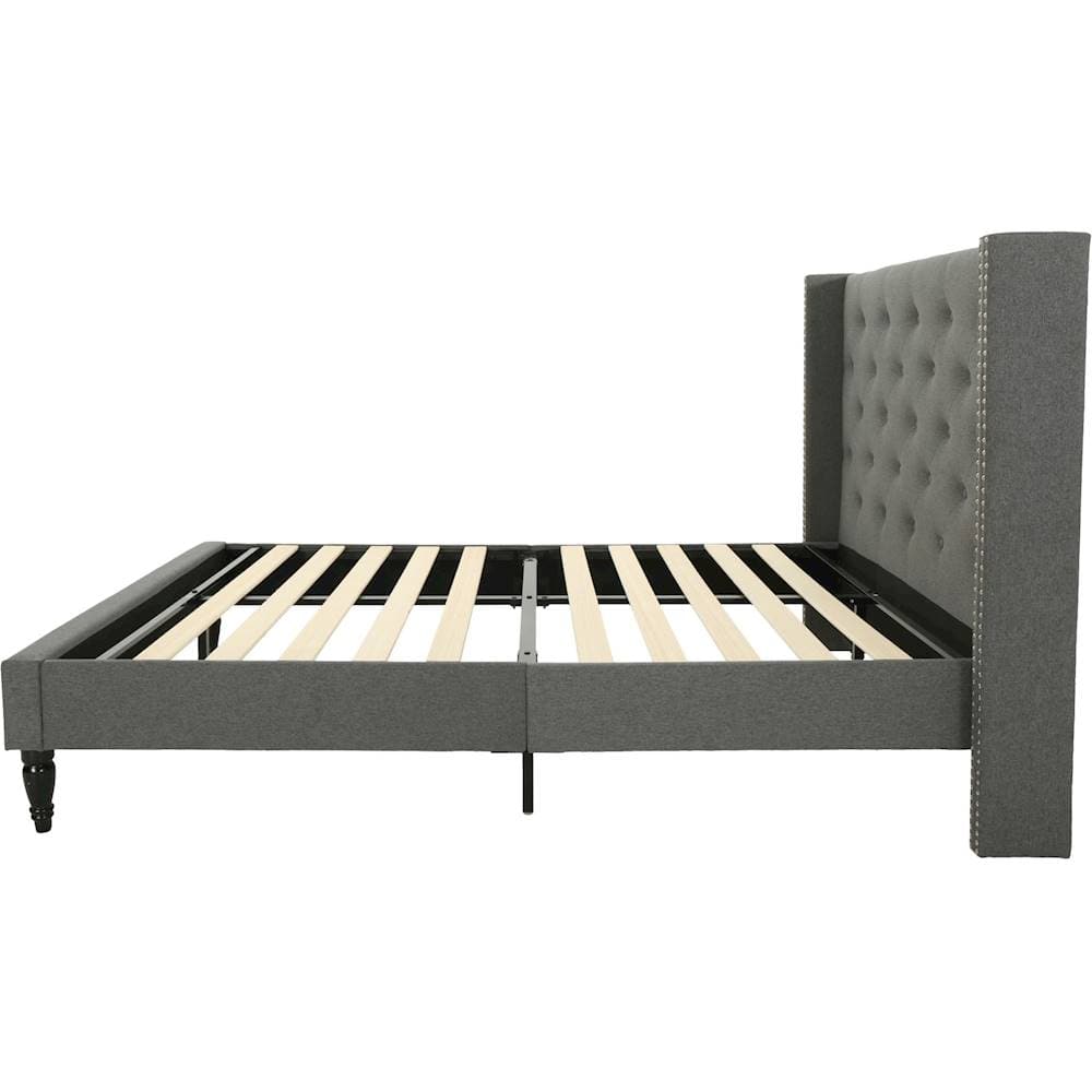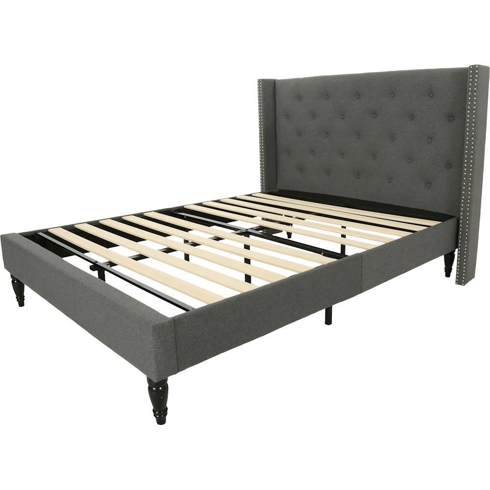 I bought this bed at the last minute for my guest room. The price was right! I love this bed, a sturdier combination of wood, metal and fabric, I have not seen for $350. The only reason I did not give it 5 stars is that the wing pieces on the headboard have a bit of give to them, even after cranking down on the attachment bits. This really should not be an issue as they seem decorative and not necessarily there for grabbing onto, wink wink. The base, feet and platform of the bed are SOLID. The finishing is nice, as it should be, and there are no loose threads or frayed fabric. The one clarification I would like to make, is that in no way did this bed take 30 min to put together. It was closer to 90 minutes by myself. Now if you have as assistant or maybe someone who is remotely handy with assembling, creating, screwing or even just staying on task, it might take less time.