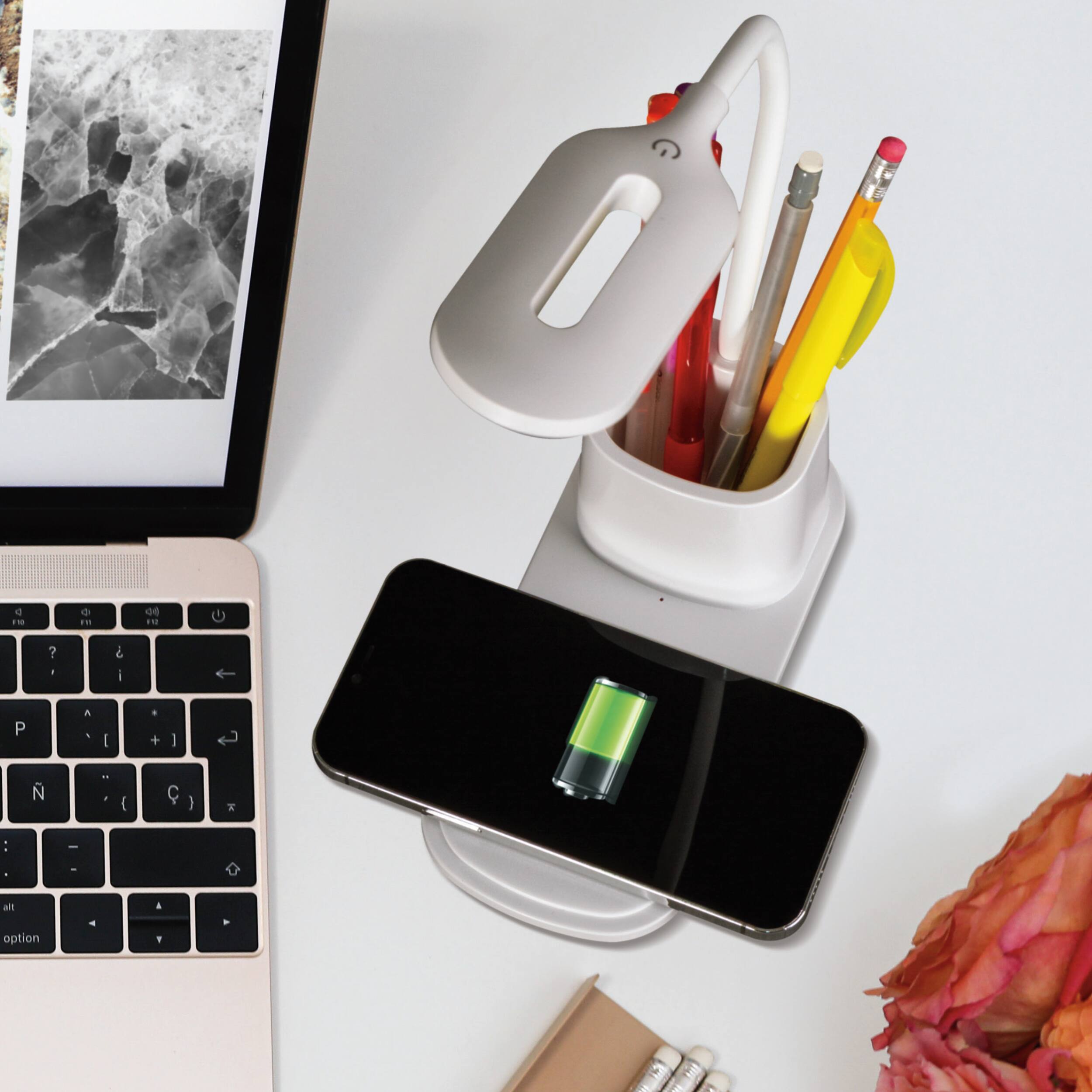 ||Posted . Owned for 3 weeks when reviewed.This reviewer received promo considerations or sweepstakes entry for writing a review.Decent desk lamp and wireless charging. I wish there was more room for extra pens.