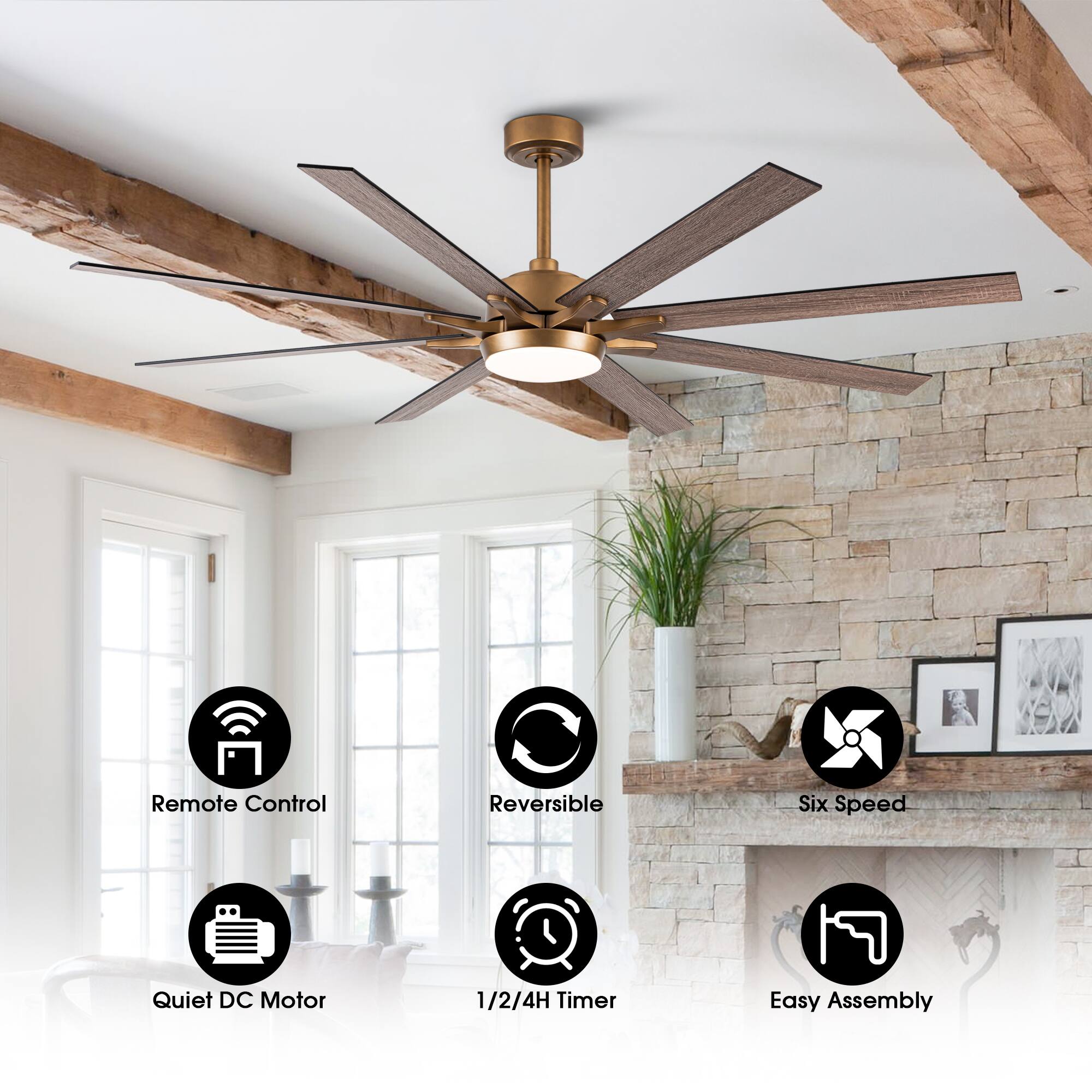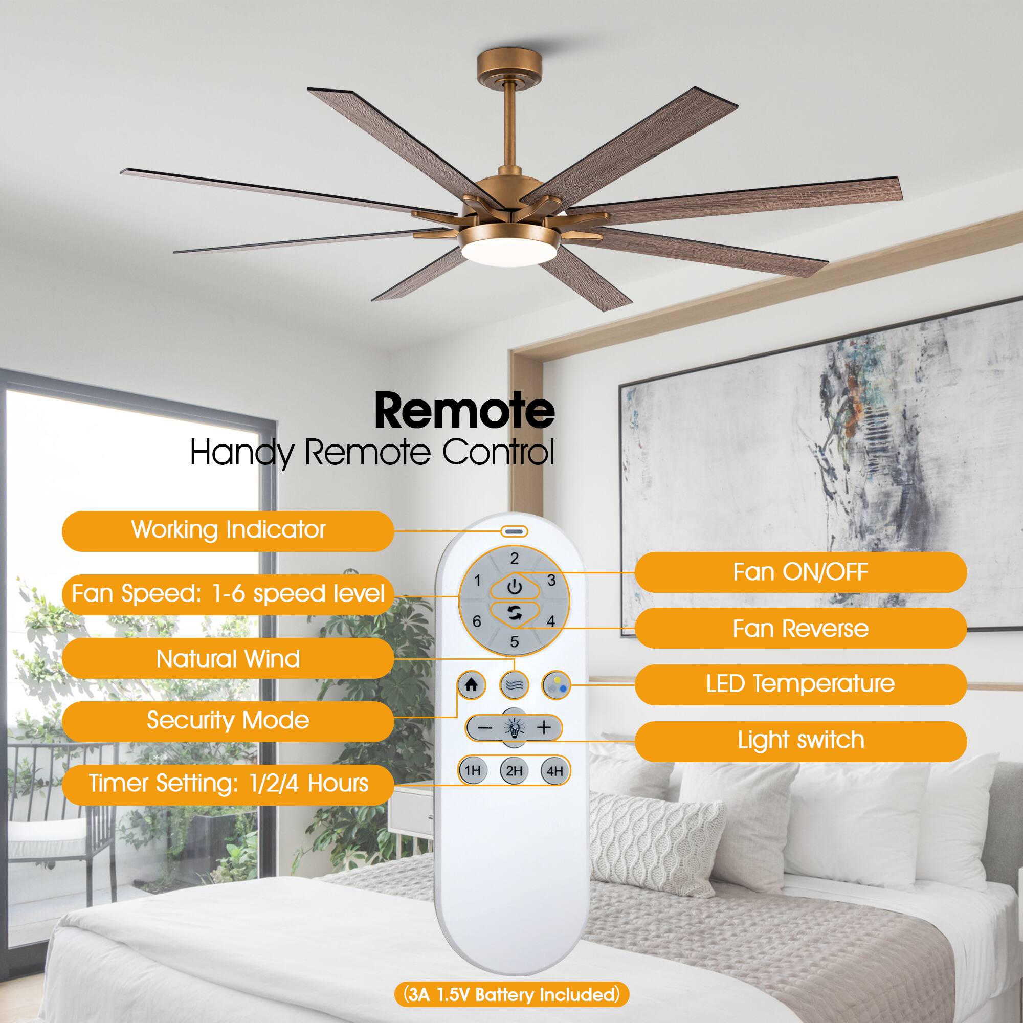 This is a large fan for big room. I replaced a ceiling light fixture with this fan for a 15'x18' room, and it still feels quite large. I like its quiet operation even with long blades. The fan also has adjustable speed and light color. The light is dimmable, and it would be nice to have even brighter light for big room.
