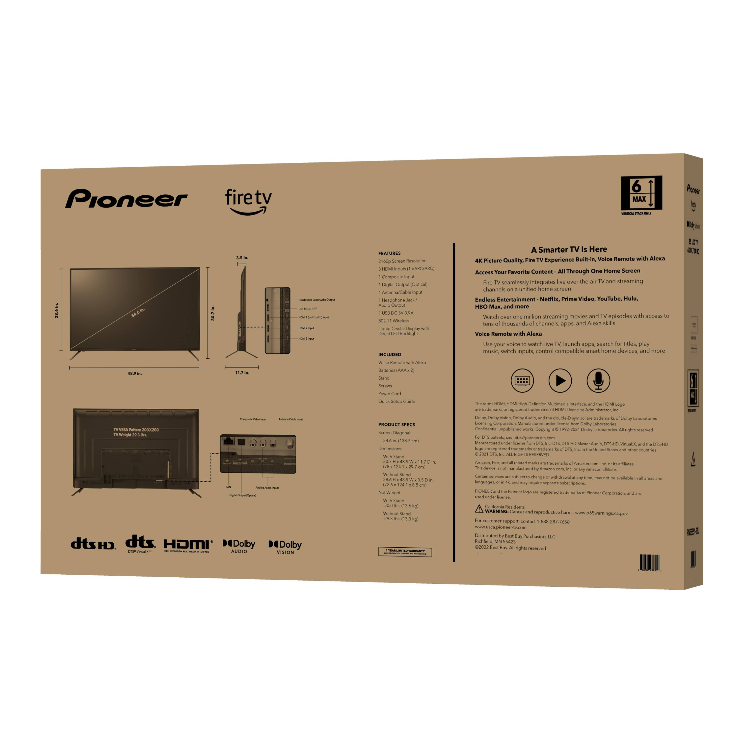 Excellent TV. Nice sound and Picture , especially for a budget 55" tv. Very easy to set up. You really don't need to pay someone to set this up UNLESS you don't have 2 HEALTHY people available to help you unpack it safely. I was a little concerned about it having 3 hdmi ports. If you have more than 3 hdmi accessories, you need to think about that. And it doesn't have a 2.1 port. The sound is powerful enough for a fairly good size room. For my 15x15 living room I have the sound level on about 8-12 out of 100, but I don't like things real loud. If you want to make use of the Dolby Vision on a ROKU device make sure you buy the right roku STICK. The newer Roku stick comes with a power cord and we did need to use that. You neeed a tv stand of more than 48" wide. My tv stand was 48" with curved edges and we had to switch some furniture around. It has the ability to give 4K like picture on non 4K things so we are probably not going to pay extra to upgrade our Netflix package. Goodness nows they make enough money off you. Pioneer has been making audio/visual for a long time and I didn't buy the extended warranty, but it is worth considering especially if you live in an area with "brown outs" or irregularities in your electricity supply. This was true when I lived in WV, but where I live now is real stable. It does come with a 1 yr warranty from Pioneer. You might want to check out their warranty terms and decide after reading that. I live near a big city, so getting warranty service is something that probably wouldn't be hard for me, but that is another thing you should consider. I'll try to do another review after weve had a for a linger time to give you a better idea about its depenability. And there are instructions online if you get a darker picture with using the Dolby Vision setting with your ROKU stick to adjust for that. Hope that helps.