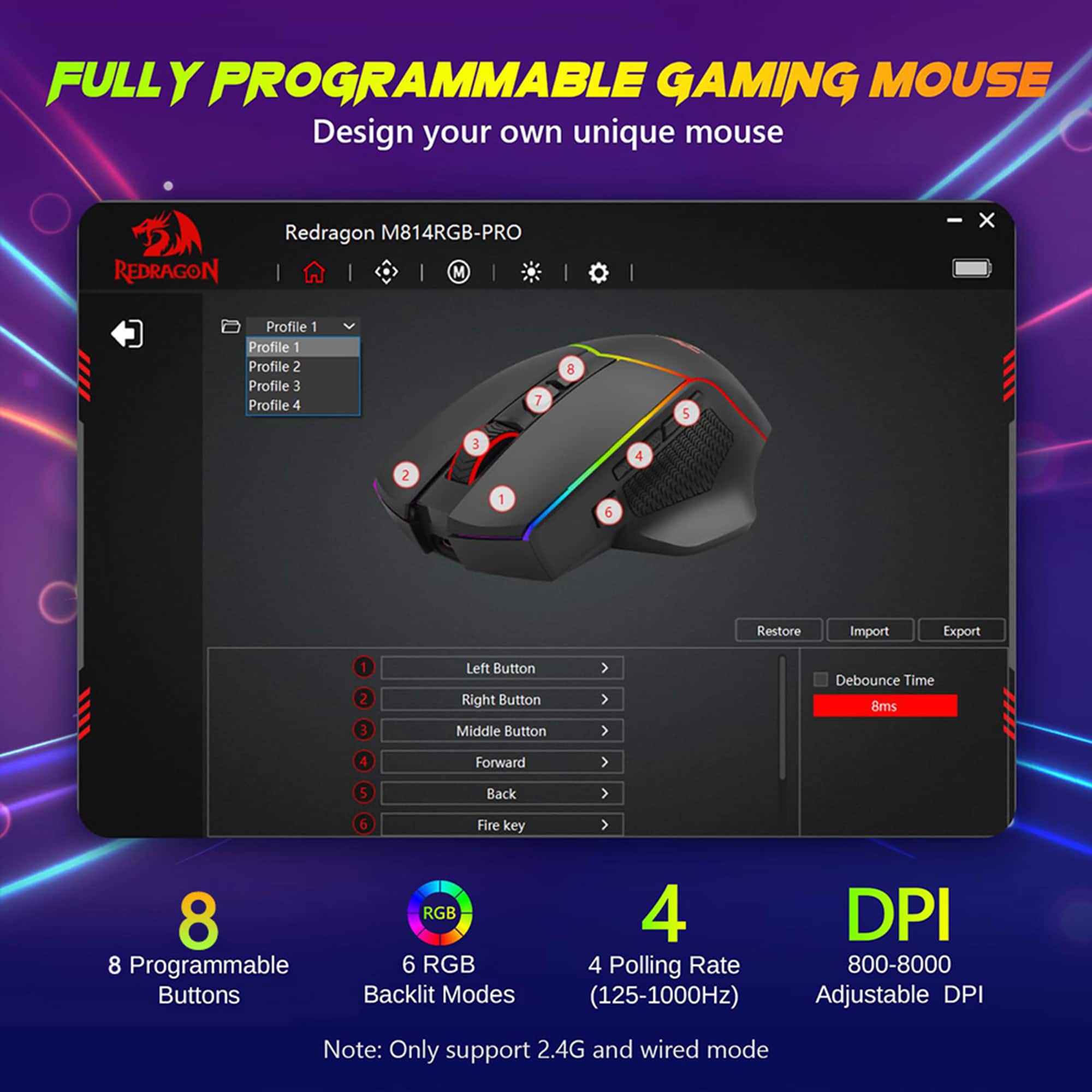 This review is from REDRAGON - M814RGB-PRO Wireless Gaming Mouse, Tri-Mode, 8000 DPI, RGB, 8 Programmable Buttons, 250Hrs for PC/Mac/Laptop - Wired - Black