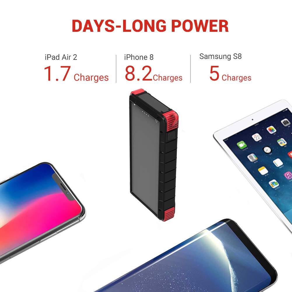 Customers are positive about the long battery life of the 24000mAh Solar Power Bank, with one customer reporting getting about 8 charges on their iPhone XR.