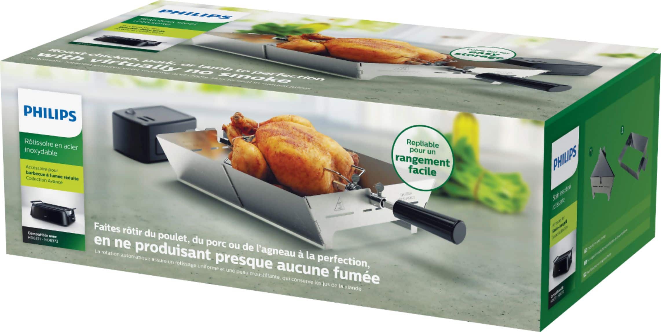 I wasn't aware this accessory was an option, and ordered it with a rush ship because I was legitimately excited about doing rotisserie on my Phillips grill. My biggest complaint, and the reason that I'm going to return it is simple. The clips on the motor have it sitting on the outside of a metal bracket, and the weight of the motor combined with the cheap metal causes the spit to slide out of the socket. If you're multitasking, you can come back to your entree 20 minutes later to see it searing on only one side, because the continuous tension on the metal bracket removed the spit and stopped the rotation. Terrible design.