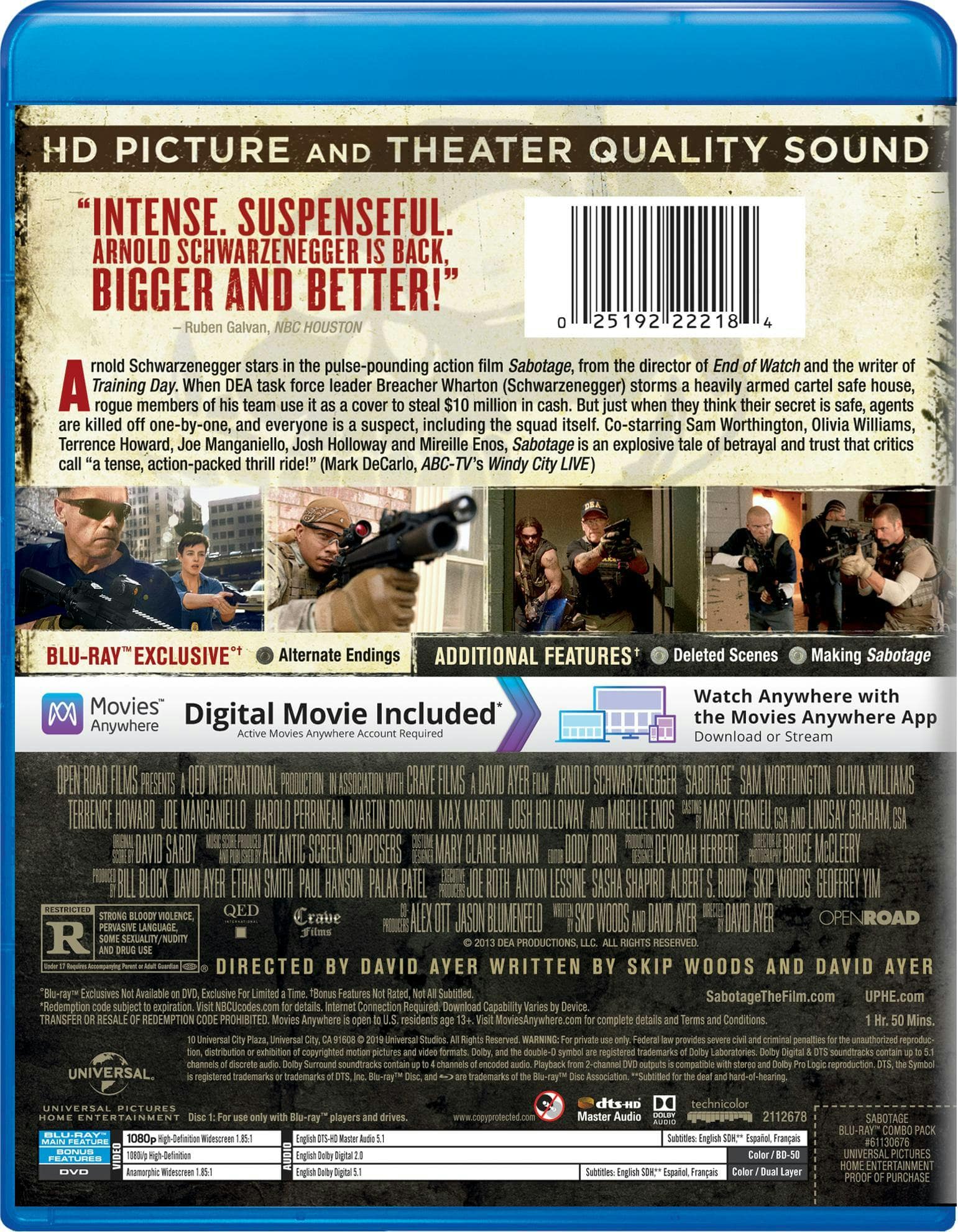 what can i say about sabotage it is a good action movie with with alot bullets and blood and i think it is one of the better arnold movies in the last couple of year all i can say it is a good action movies from start to finish and i hope arnold makes more movies like this in the future so check it out if you want an none stop adrenaline rush movie
