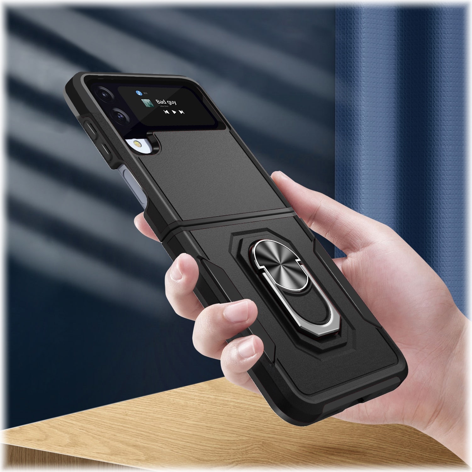 I particularly like the flip out, swiveling, stand/holder. I use it to hold my phone securely, with my index finger through the hole for single-handed control. It also works adequately for holding the phone on vehicle vent-mount magnetic holders temporarily, though it is below the centerpoint and requires perfect alignment to prevent falling. There is an adequate area below the notification window cutout to place a magnetic holder stick on plate for long trips. The stand works great for landscape position, and can kinda work for portrait position if you fold the phone about 30 degrees. And, with one hand, I can manage to flip it open and closed just like Kirk!