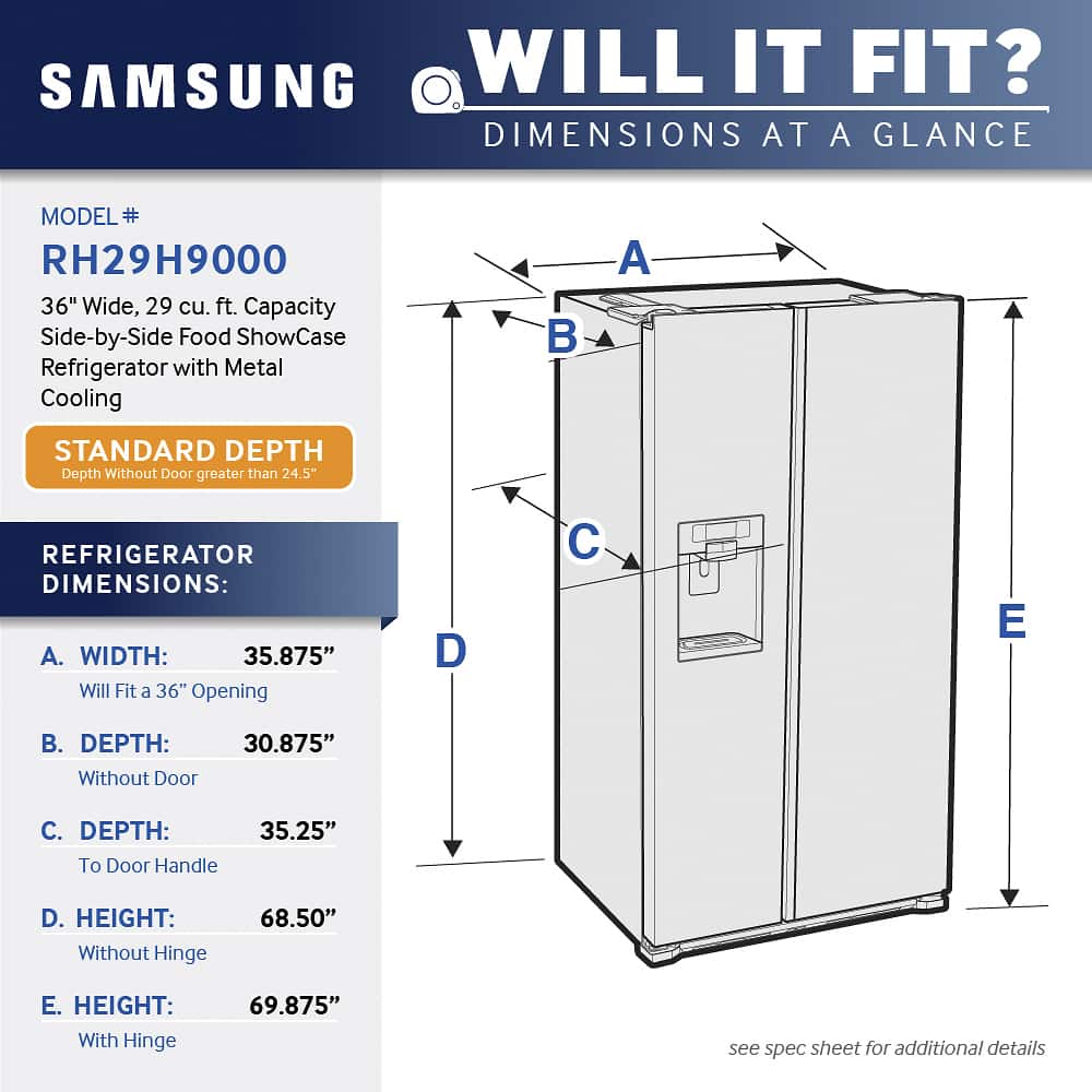 BE aware of the size, and if you plan to push it into a slot with walls on each side, you have to allow the fridge to protrude several inches on each side for the doors to open fully. This is annoying because instead of being able to push the fridge all the way to the back wall, I have to have it pulled out in the floor. Otherwise, as I said, you can't open the doors fully to remove bins or shelves and it's hard to reach in with the doors only partially opened.