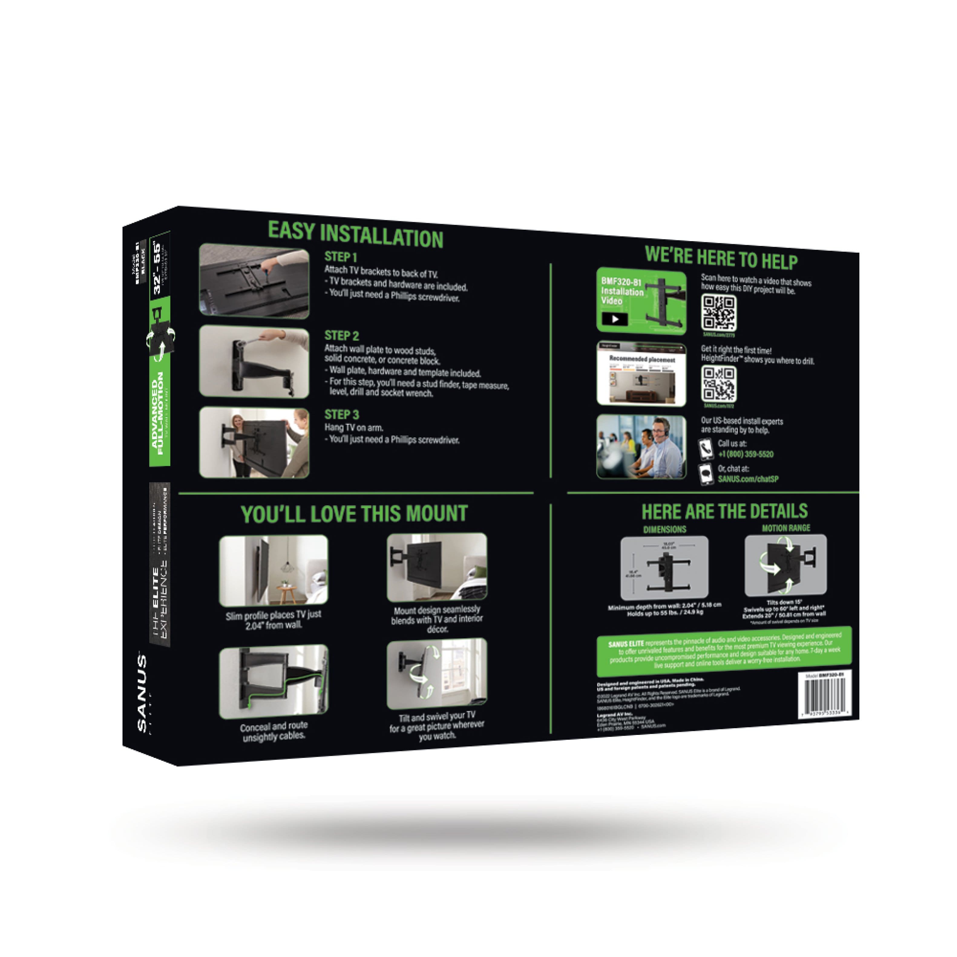 Hello, Thank you for your review! We're thrilled that you had a great experience with the SANUS Elite - Advanced Full-Motion TV Wall Mount for Most 32"-55" TVs up to 55 lbs. Your feedback is appreciated and reaffirms our commitment to excellence. Should you require any further assistance, please don't hesitate to reach out to our customer support team at [email protected] or call 1-800-359-5520. Thanks, SANUS support