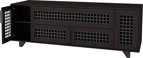 This is a beautiful Sanus Media Center-- very modern, strong wood and products. It completely hides all your wires so it keeps the area looking very clean. I love this unit. The only negative is that assembly will take several hours-- as there are many pieces, but it is worth it in the end. Also houses our 65" curved Samsung TV and soundbar extremely well.