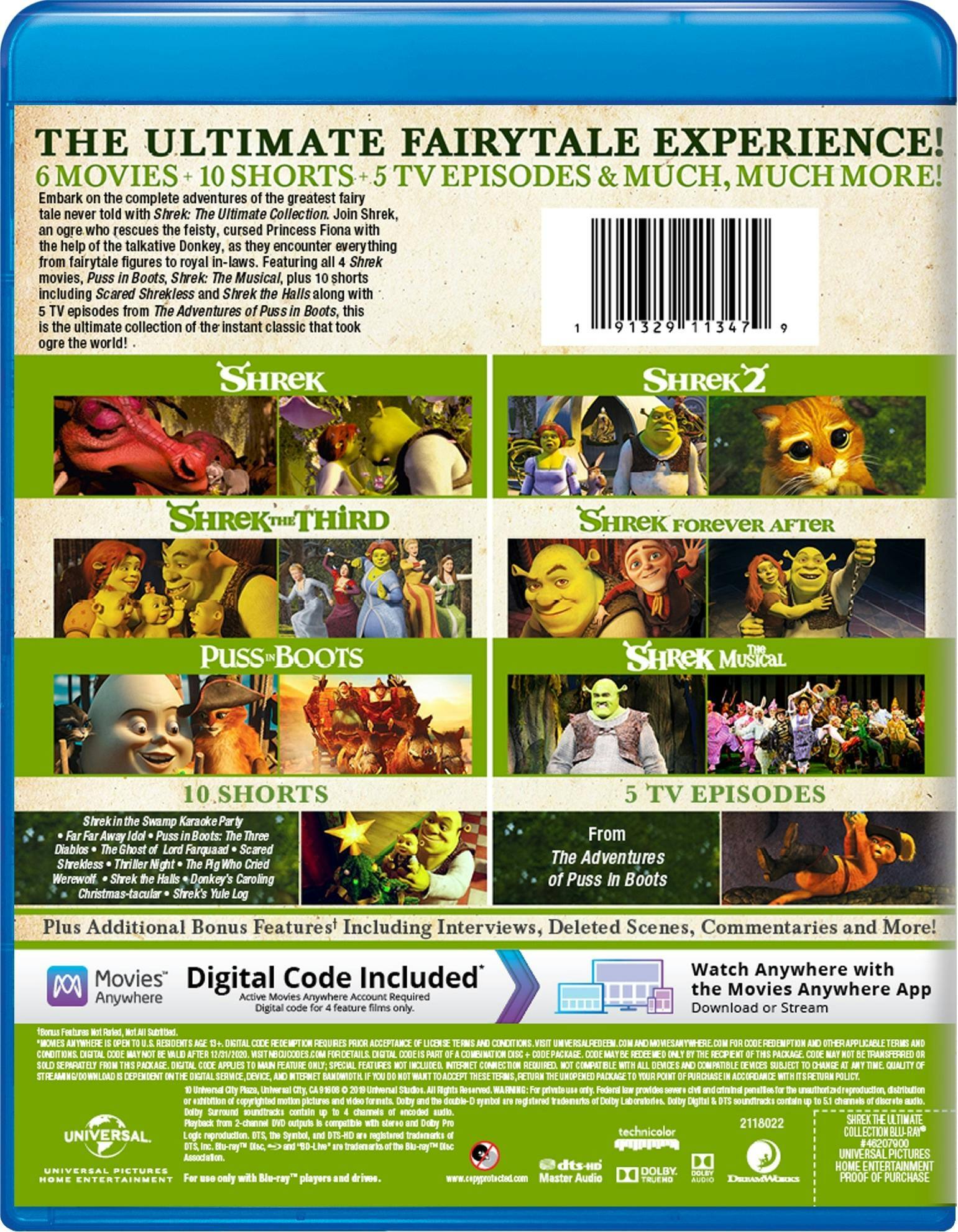 Everything Shrek in one collection. Includes Shrek, Shrek 2, Shrek the Third, Shrek Forever After, Puss in Boots, Shrek the Musical, 10 shorts, and 5 TV episodes. Includes a digital copy. GREAT BUY.