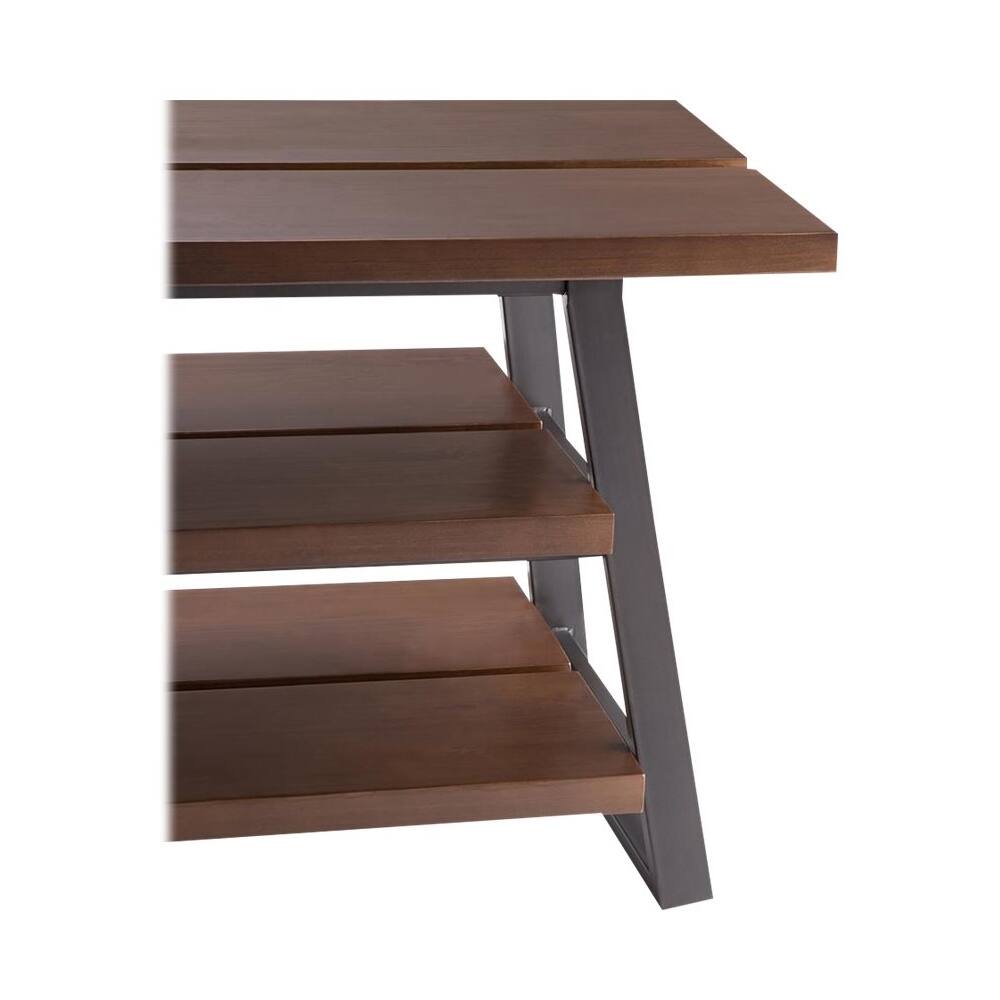 This stand is very sleek and modern looking. It is made off solid wood, it's a grade B pine boards that are very lightly stained.