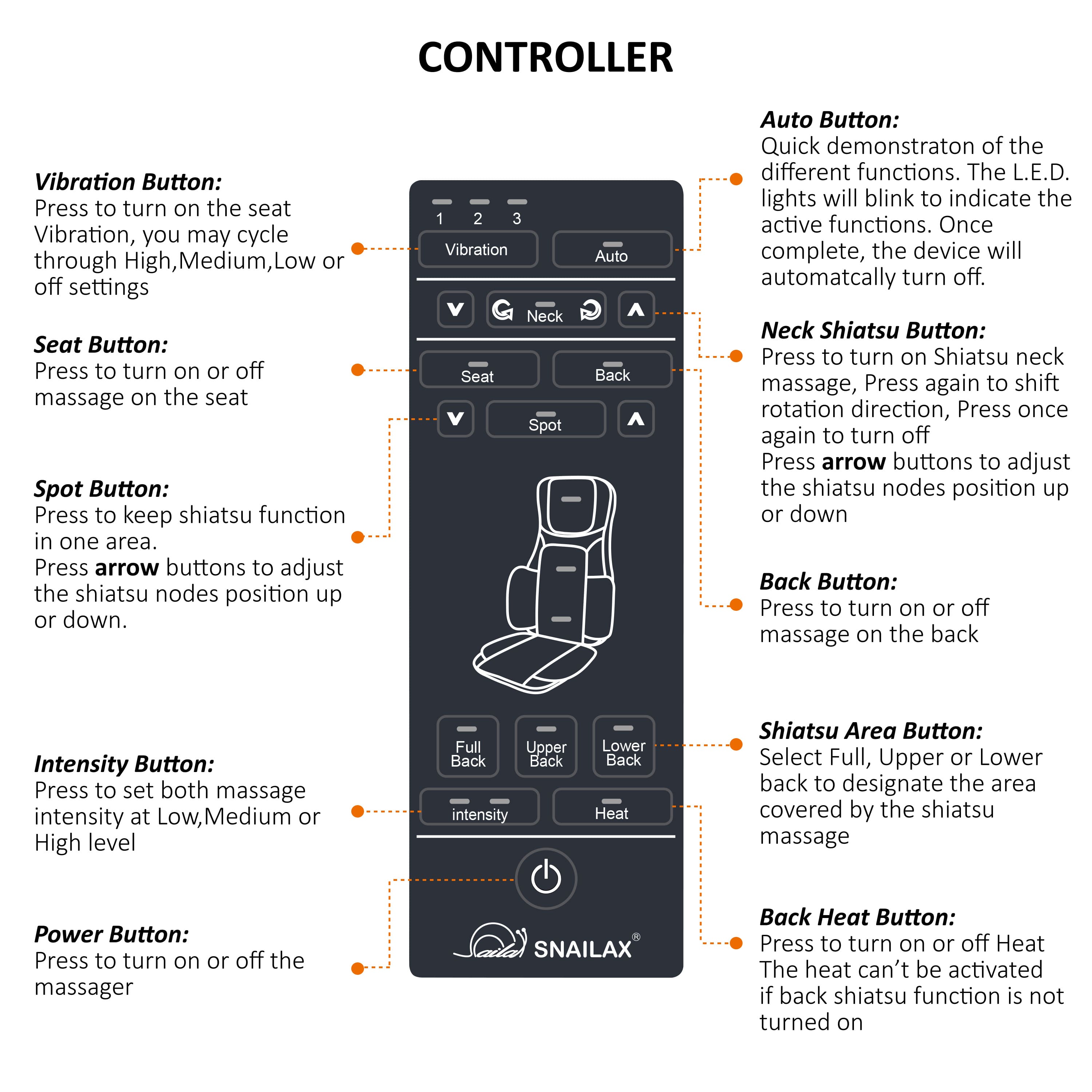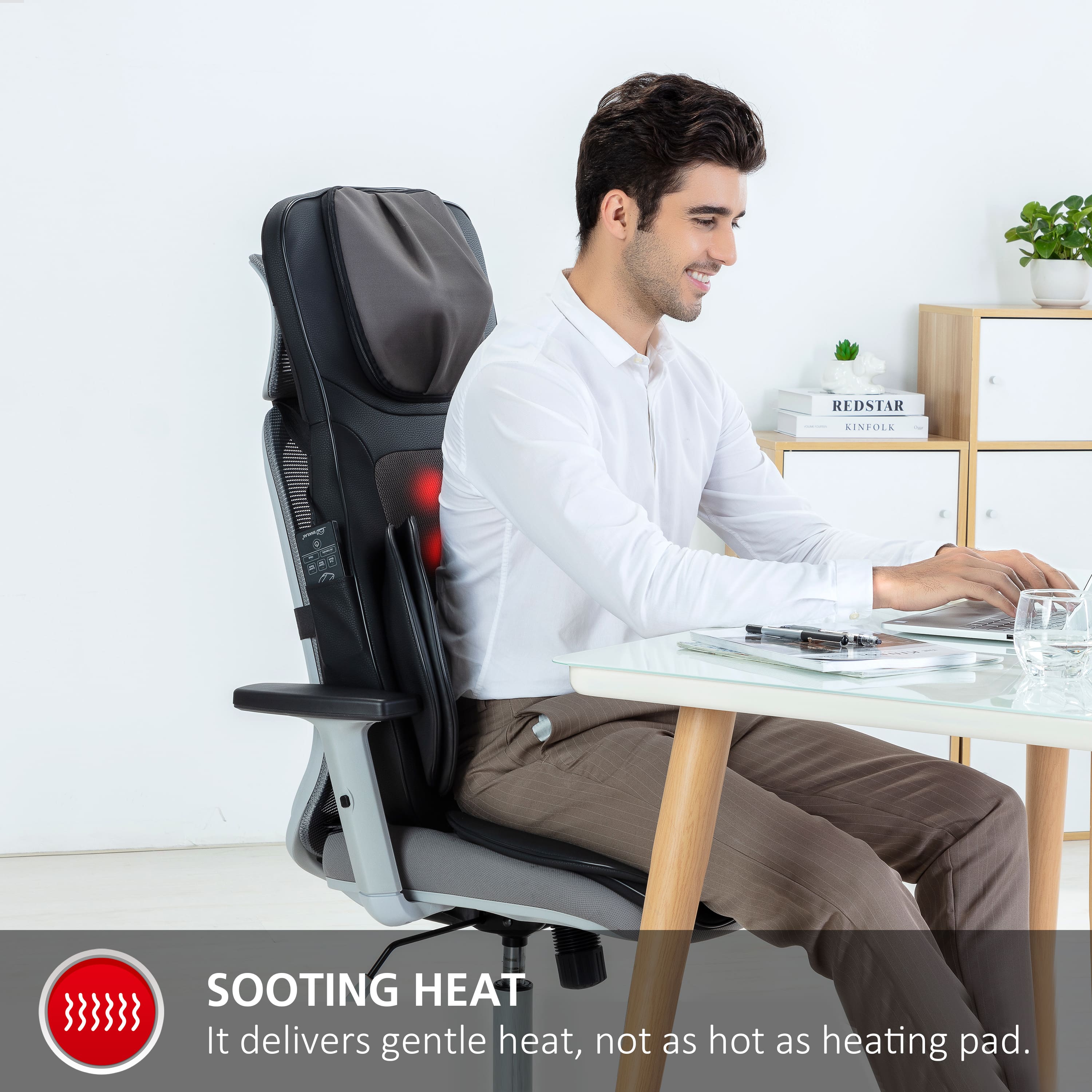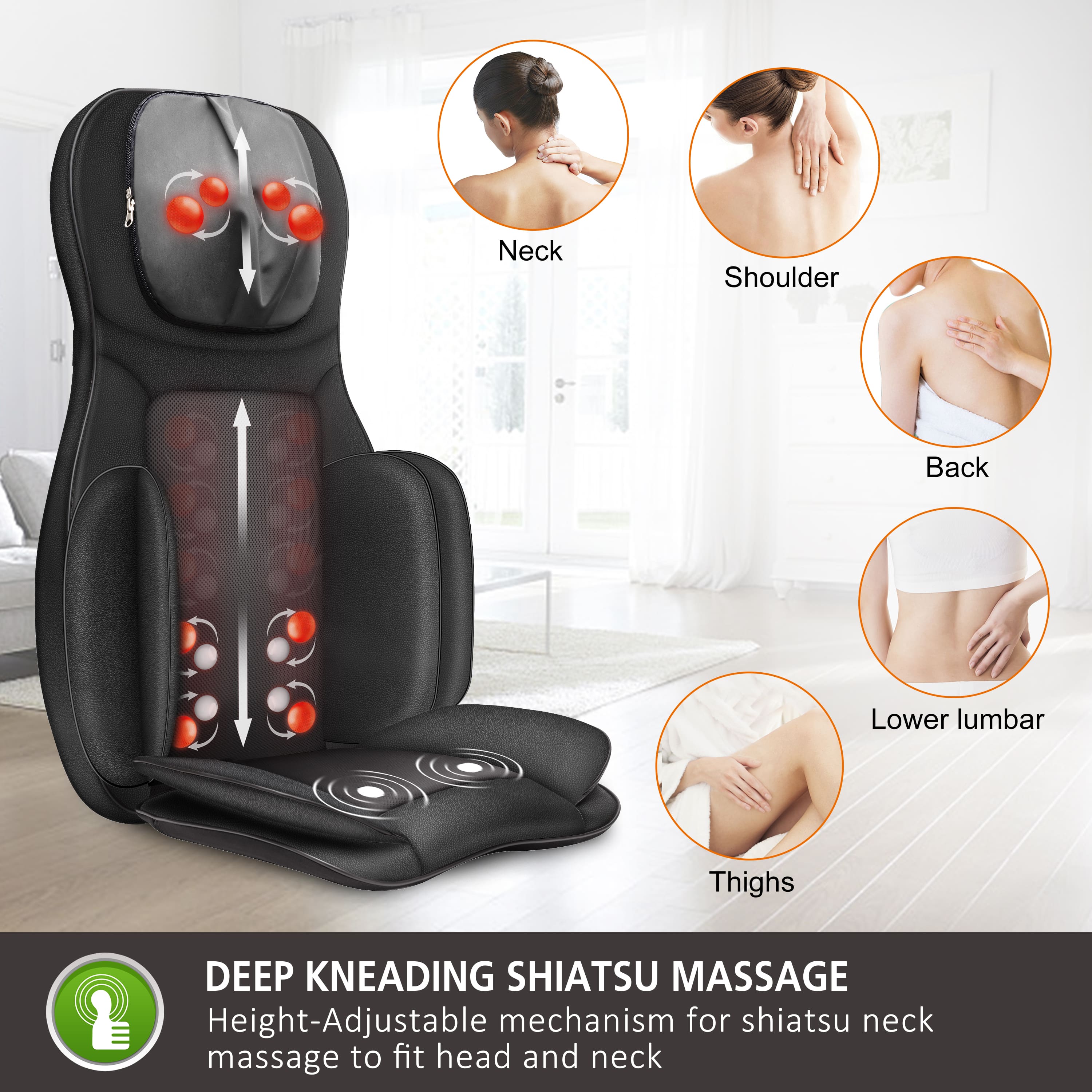 This masaage seat is awesome! It has an adjustable air cushion in the seat portion and back portio and the neck rollers adjust in different directions. The back massaging track rollers are adjustable by sections and the heating option works well too. The easy to use remote is quiet and provides many options to choose particular areas you want to masaage. I highly recommend this chair!