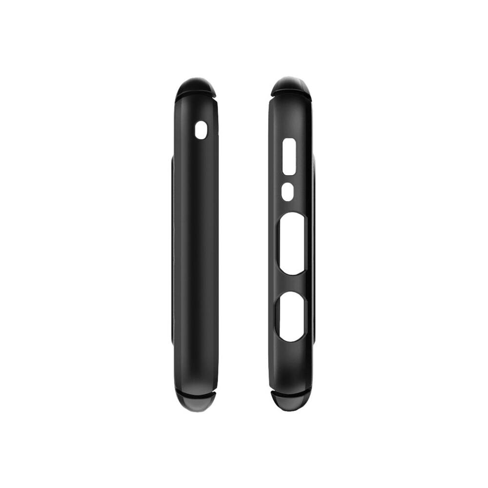 I hate bulky phone cases, so this thin case is perfect. Has cut-outs for inputs and buttons and it grips to the phone perfectly. It has a magnetic plate on the inside so you can use it with magnetic mounts, but I have not been able to test how strong it is. The case is made of plastic, so it does not help with grip. You still have to be careful how you carry and hold the phone to minimize drops.