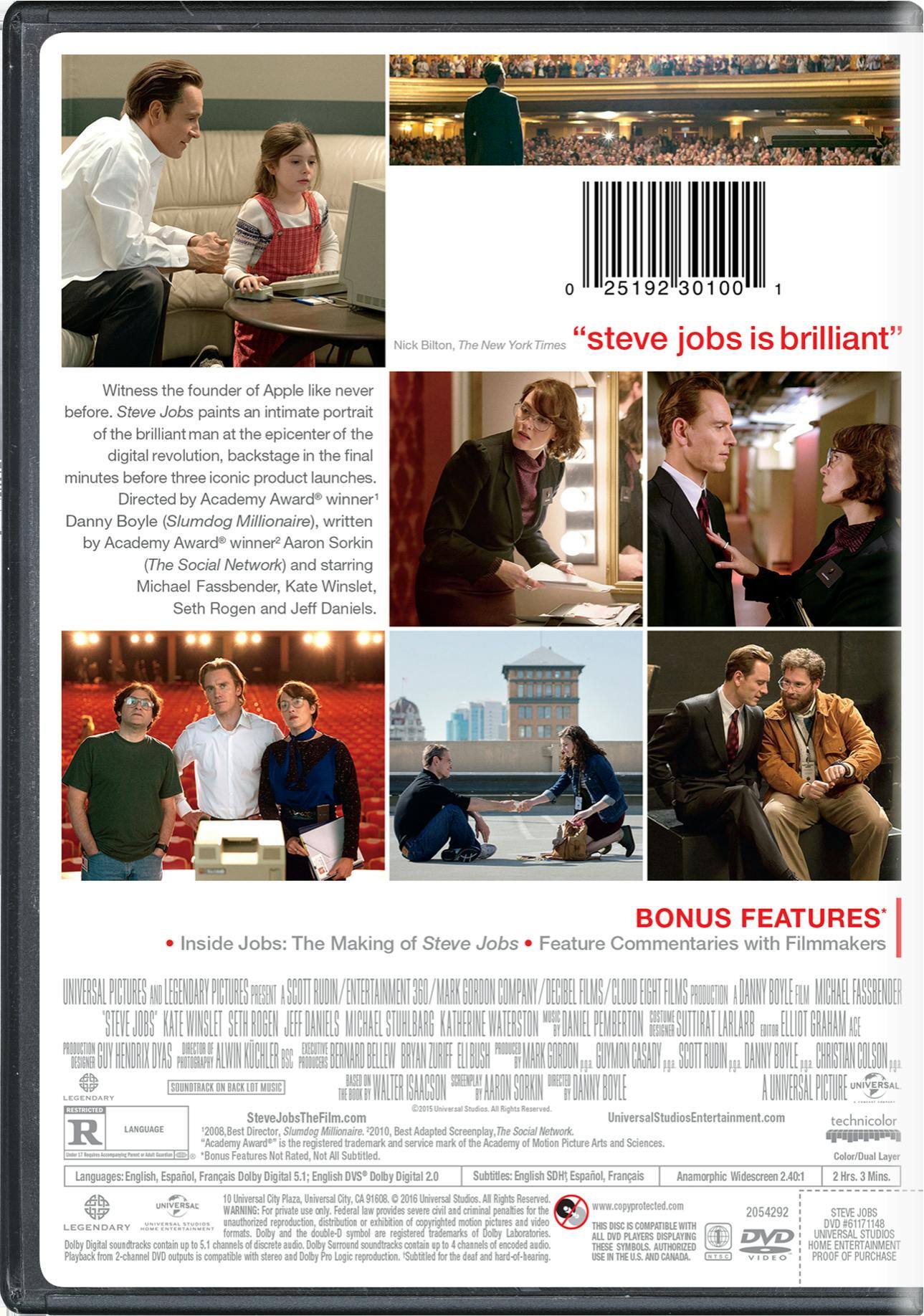 Danny Boyle once again proves why he is someone great in Hollywood with movies like 127 hours, slumdog millionaire, 28 days later, trainspotting,etc. Steve jobs had me engaged with Michael Fassbenders performance he delivers so well. Not only is this movie a million times better than jobs the movie it is most likely most realistic tale of Steve jobs yet I thought the only weak spot in the movie is the ending which seemed to humanize Steve as a good guy. Overall great film from start to finish at Kate Winslet gives a great performance. Overall it has pacing issues but it is a good movie worth buying.