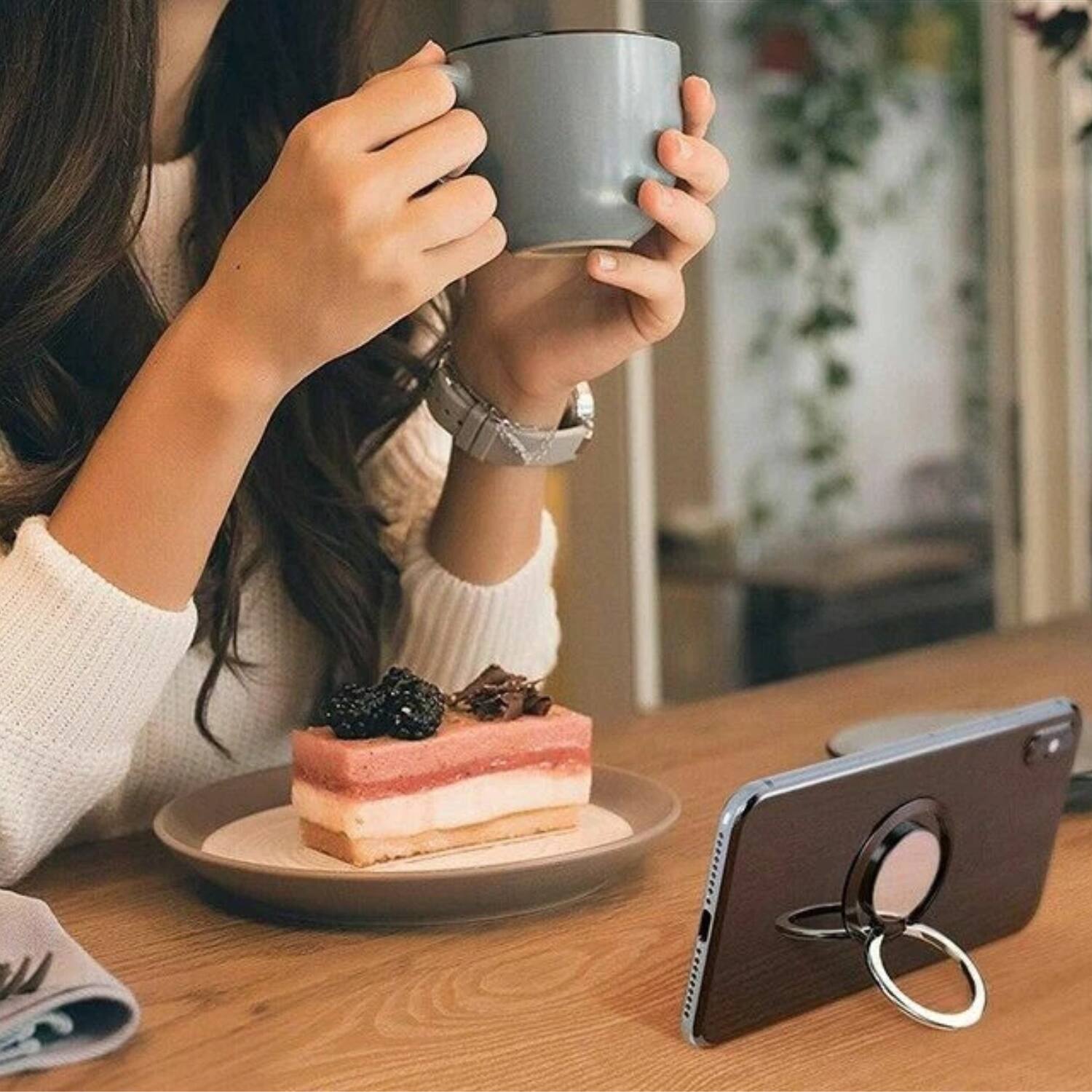 This attaches securely to my phone case to give me a way to easily hold my phone. The ring will rotate to adjust to the angle of my finger. It also is strong enough to prop my phone up on a hard surface.