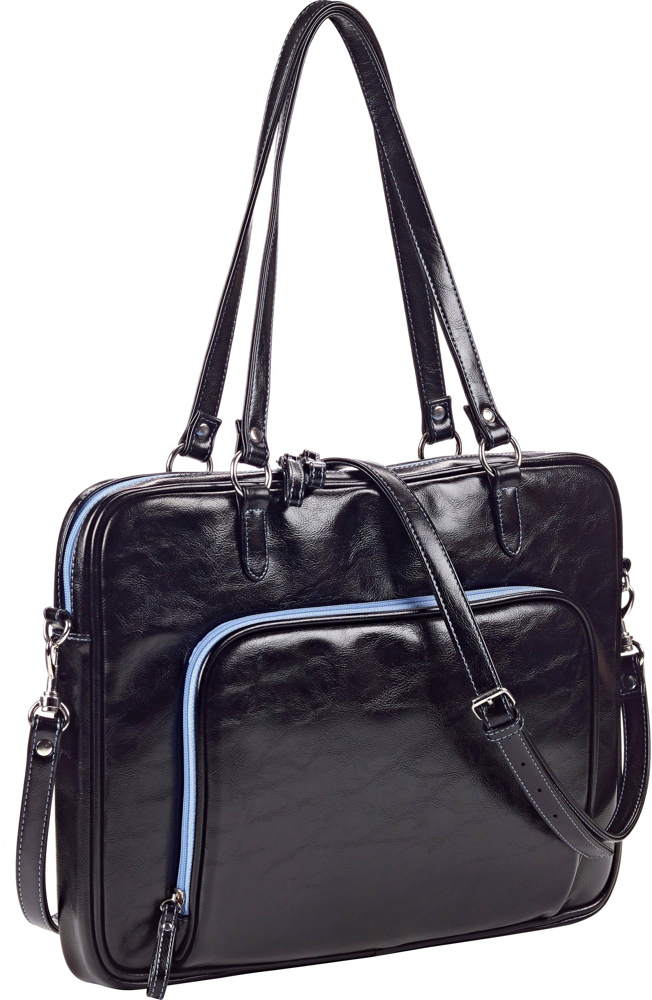 This tote is made with high quality materials. The black exterior with the blue green contrasting interior color makes this computer tote very stylish. It has shoulder straps, as well as a a cross-body strap to carry it as you like. Lots of space for accessories and a padded pocket for your computer. Love it!