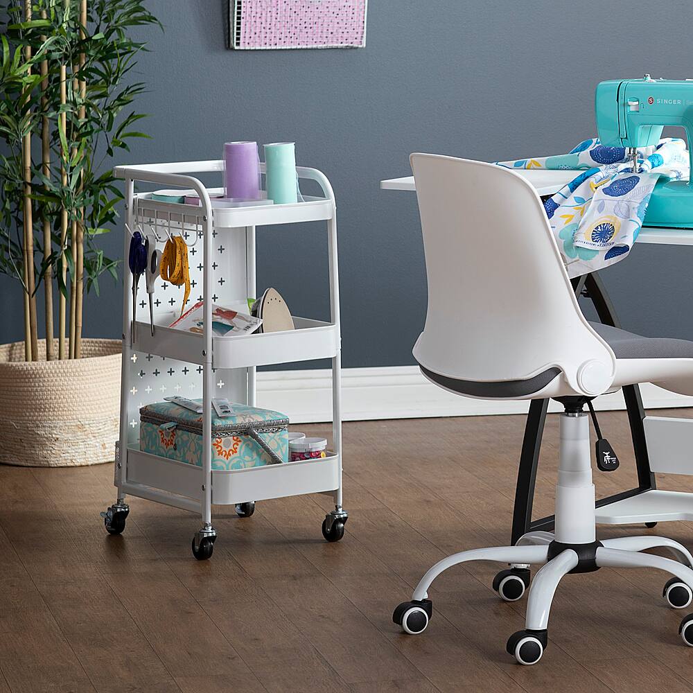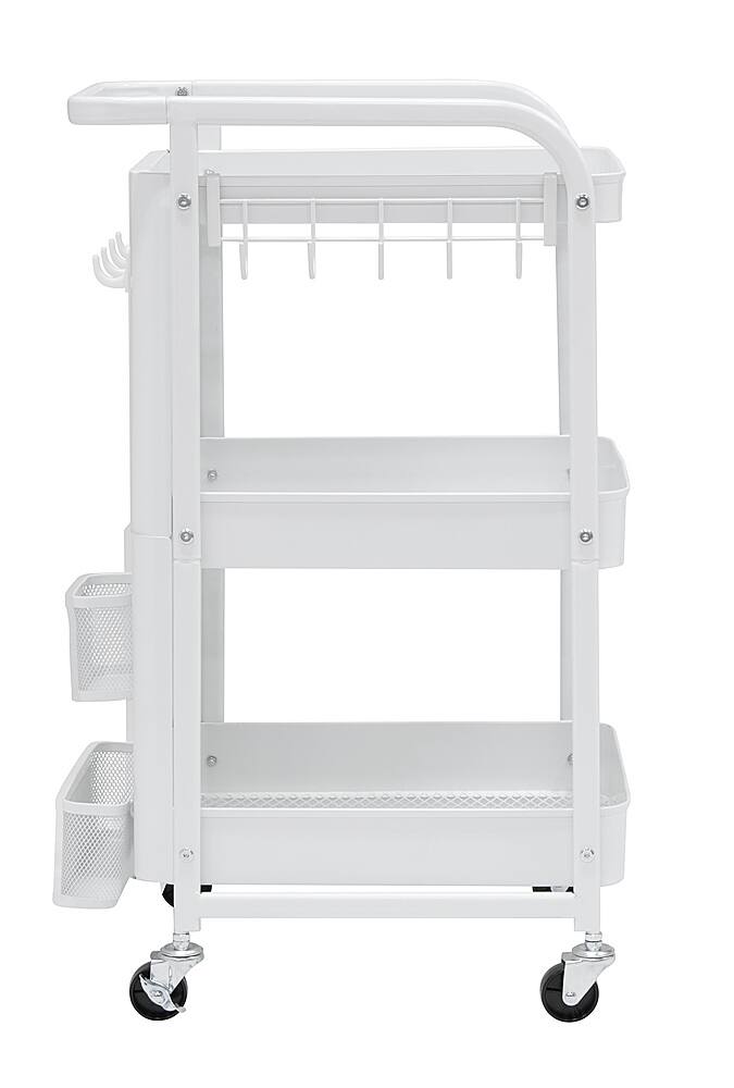 This was the perfect little cart to keep daily files, office supplies, etc. next to my computer cart. (Found some plastic bins that work well on each shelf to arrange everything to my needs.) The little rack for hanging items on the side works to keep track of my charging cords and the control cord for my speakers, too.