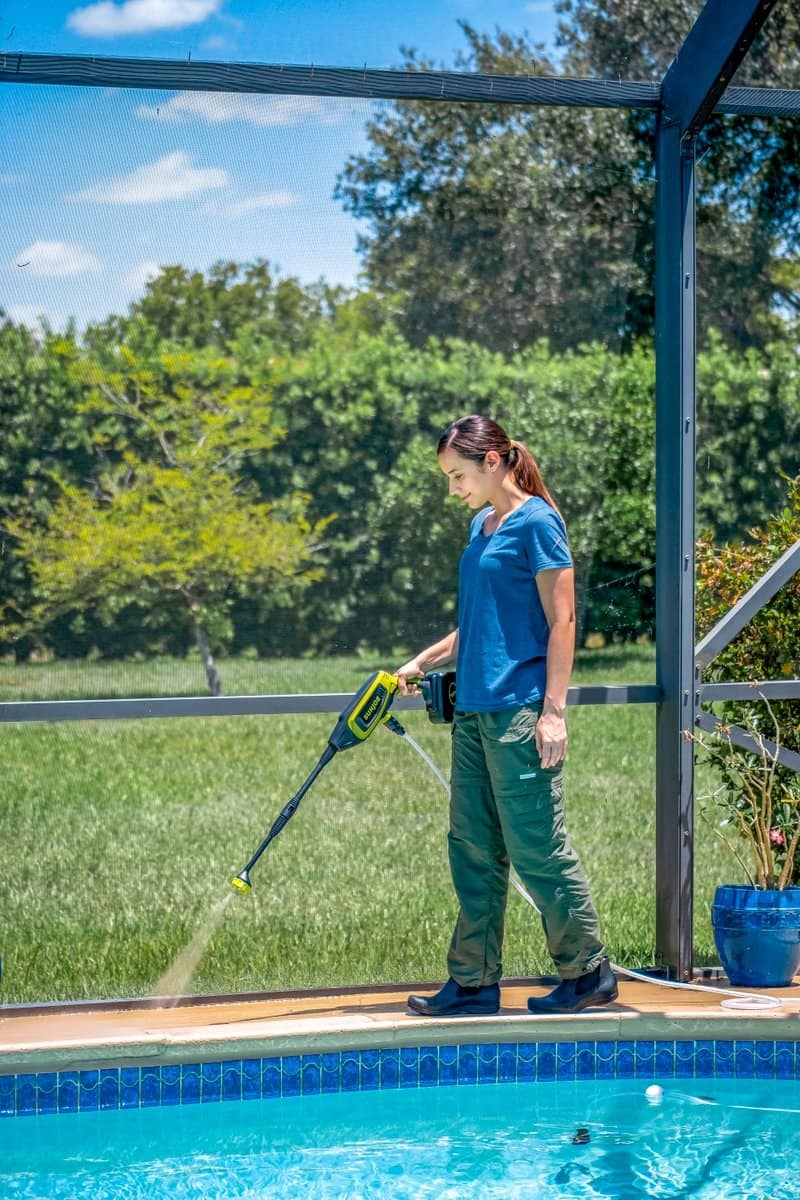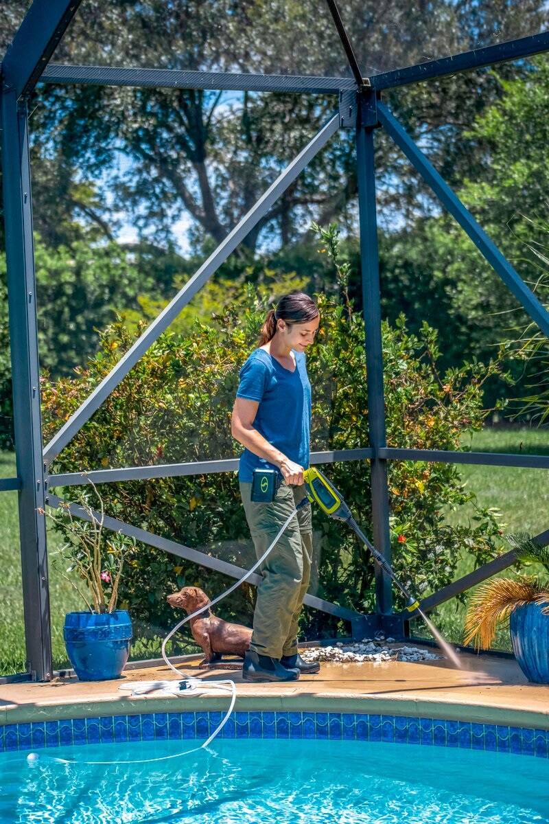 This is very weak, to the point I felt overall a standard hand nozzle on a garden hose was more effective. This struggled to rinse off soap from a washed vehicle. The various discharge patterns helped slightly, but I packed it up and will give it away to someone ( purchased several months ago, too late to return it). But, it did seem to work better than the 18v green sprayer I have from a large national home improvement store, in that it did not leak profusely from the intake or spray points.