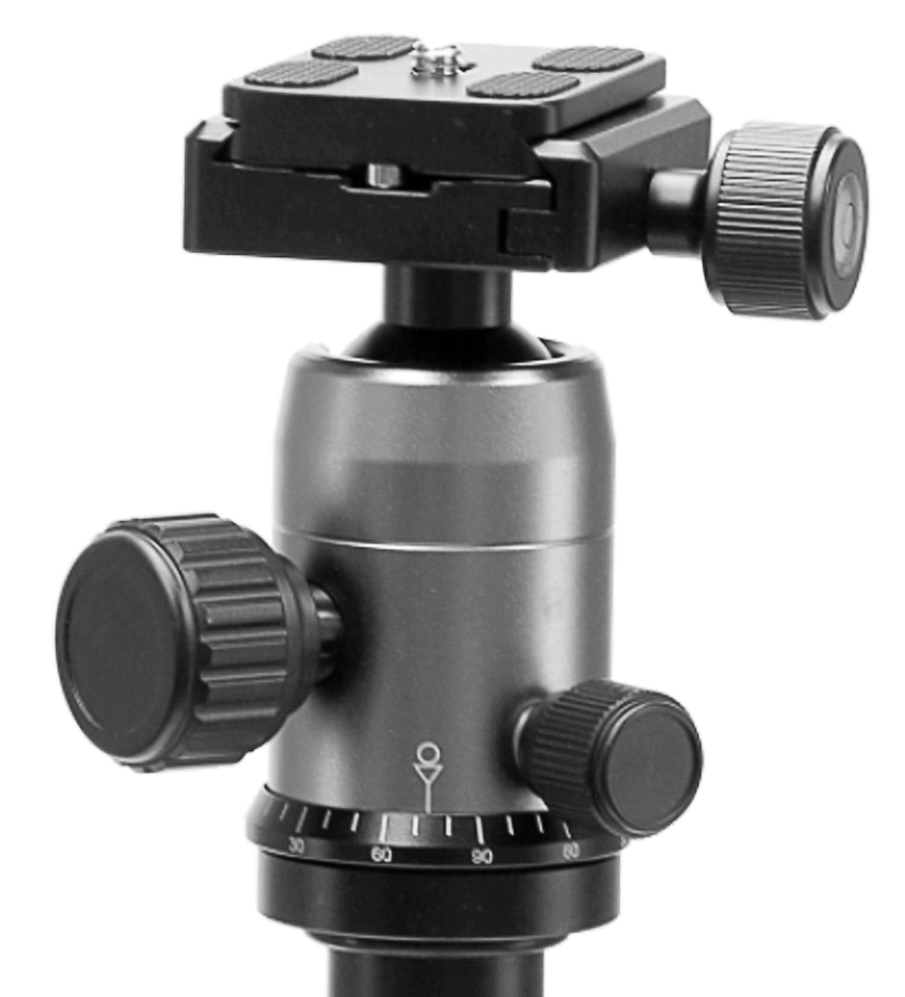 This tripod is fairly light and compact for its features. Having a level built in is helpful and the carrying case makes it easy to toss into my bag.