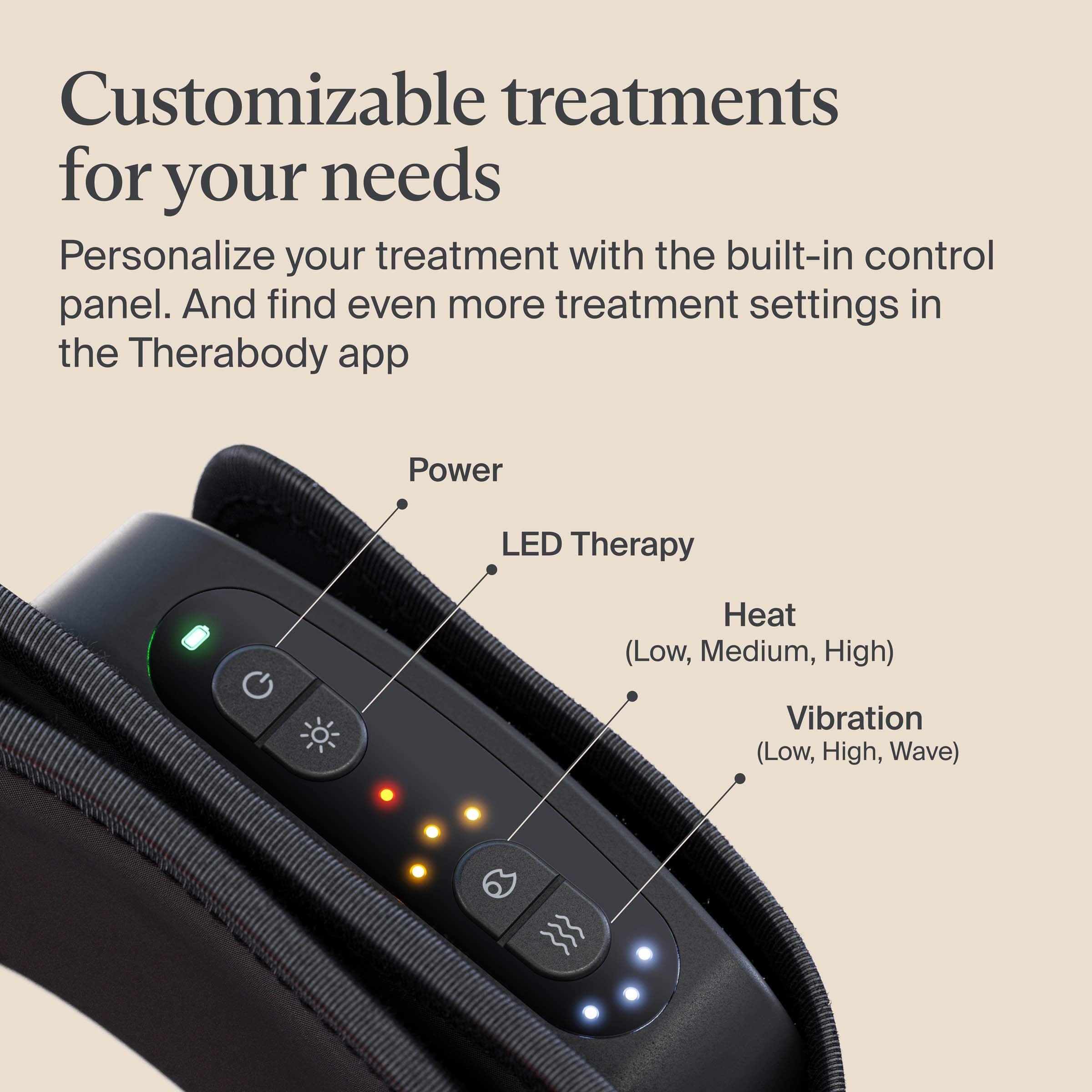 You also have the option to choose your own combination by using the buttons on the controller attached to the belt. Three buttons (heat, vibration, and infrared LED) each have three levels of intensity. You simply press each button to the level you want.