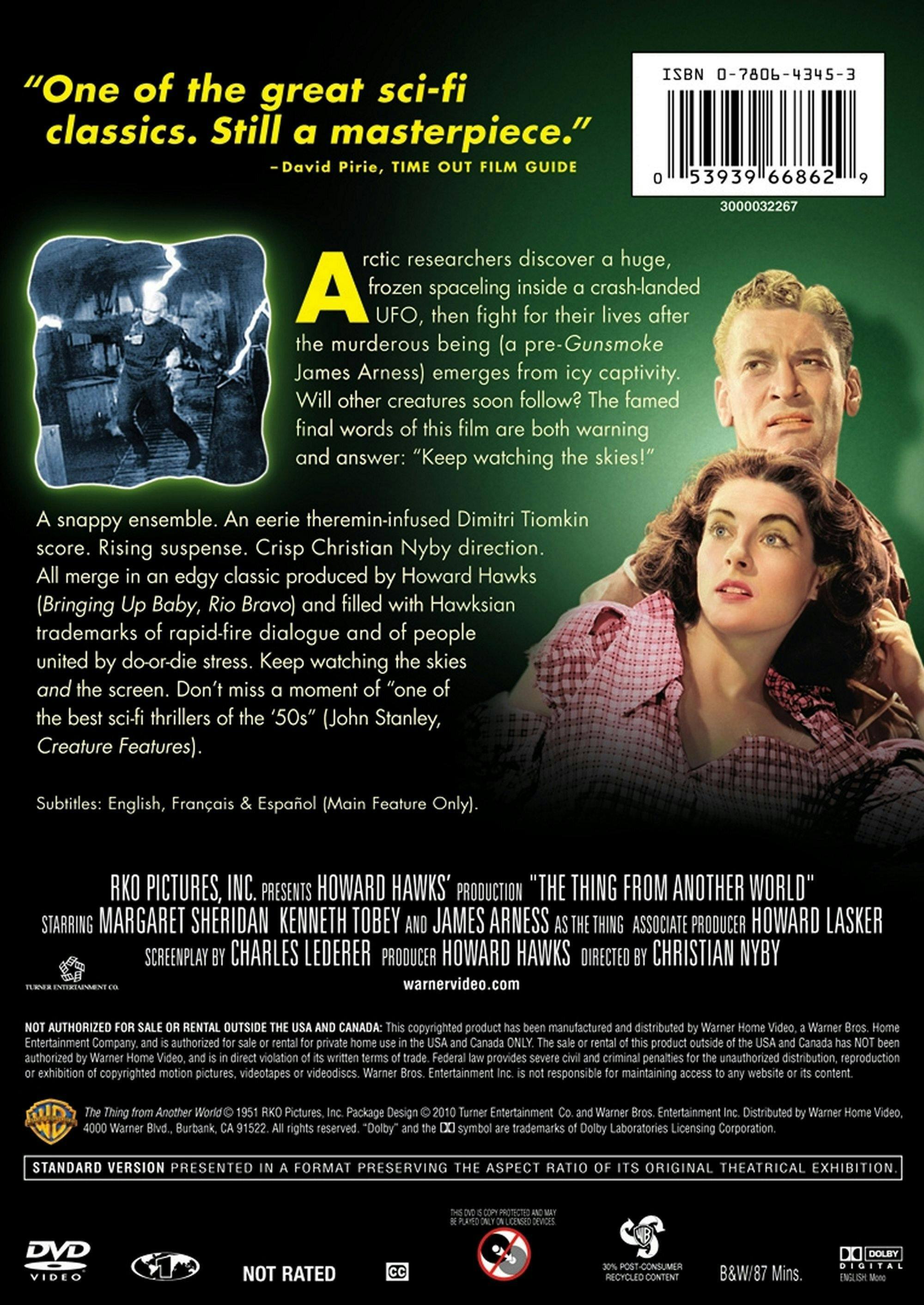 James Arness, before Gunsmoke, played the vegetable thing from outer space. A great script produced by the legendary Howard Hawks creating a suspenseful sci-fi movie. And never looked better on blue ray