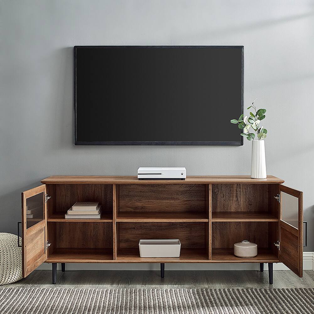 This item looks great and fits my 65” TV perfectly. The middle shelves are adjustable and the back has openings for chords. The tempered glass is a classy feature and it’s easy to assemble.