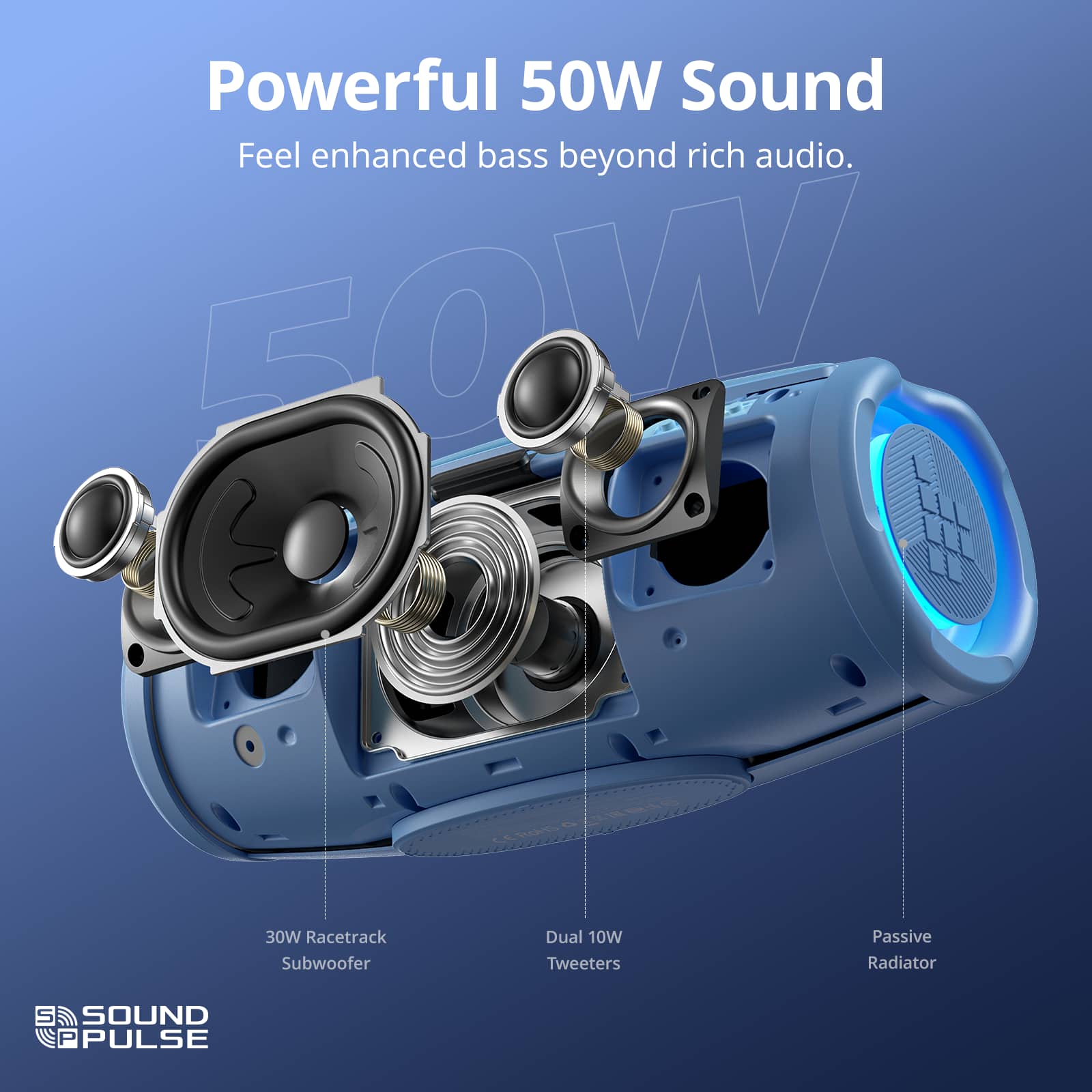 This bluetooth speaker is a great option for indoor and outdoor music lovers. It has a powerful 50W sound with rich, enhanced bass that makes listening to music enjoyable. The 20-hour playtime is a huge plus, letting me use it all day without needing to recharge. It’s also waterproof, so I don’t have to stress about accidental splashes. The speaker is sturdy and feels durable, which is perfect. I'm really happy with this speaker and would recommend it to anyone looking for a robust and reliable outdoor speaker.