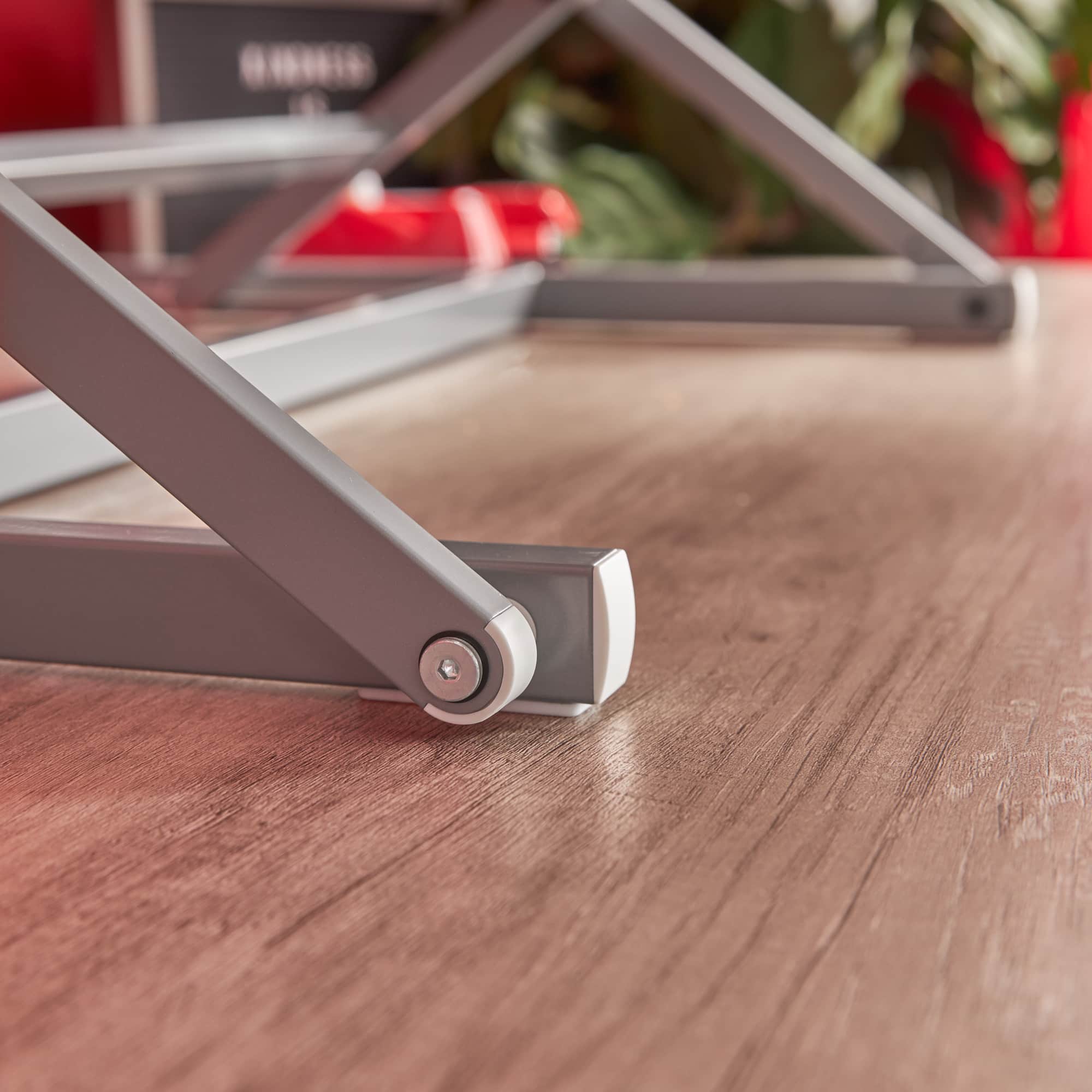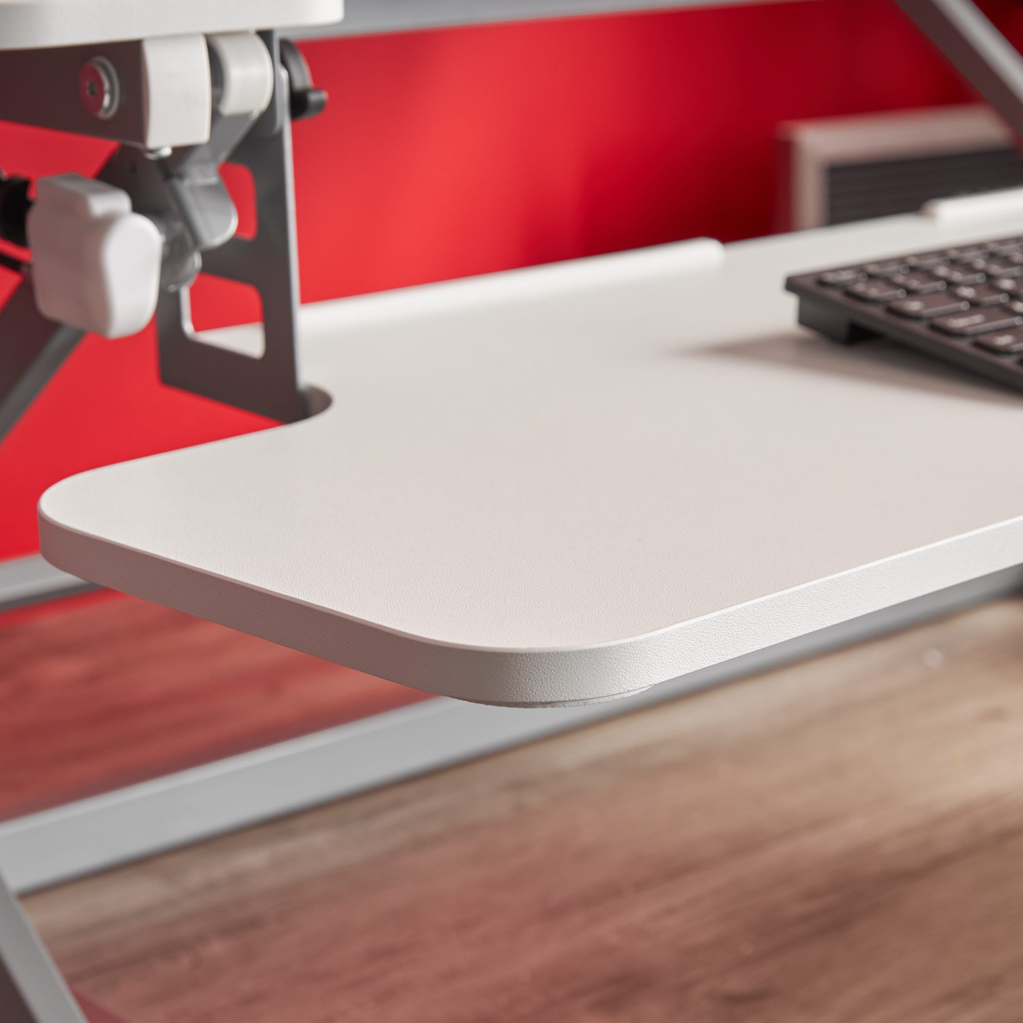 This standing desk increases the desk space and working area in addition to its intended purpose.