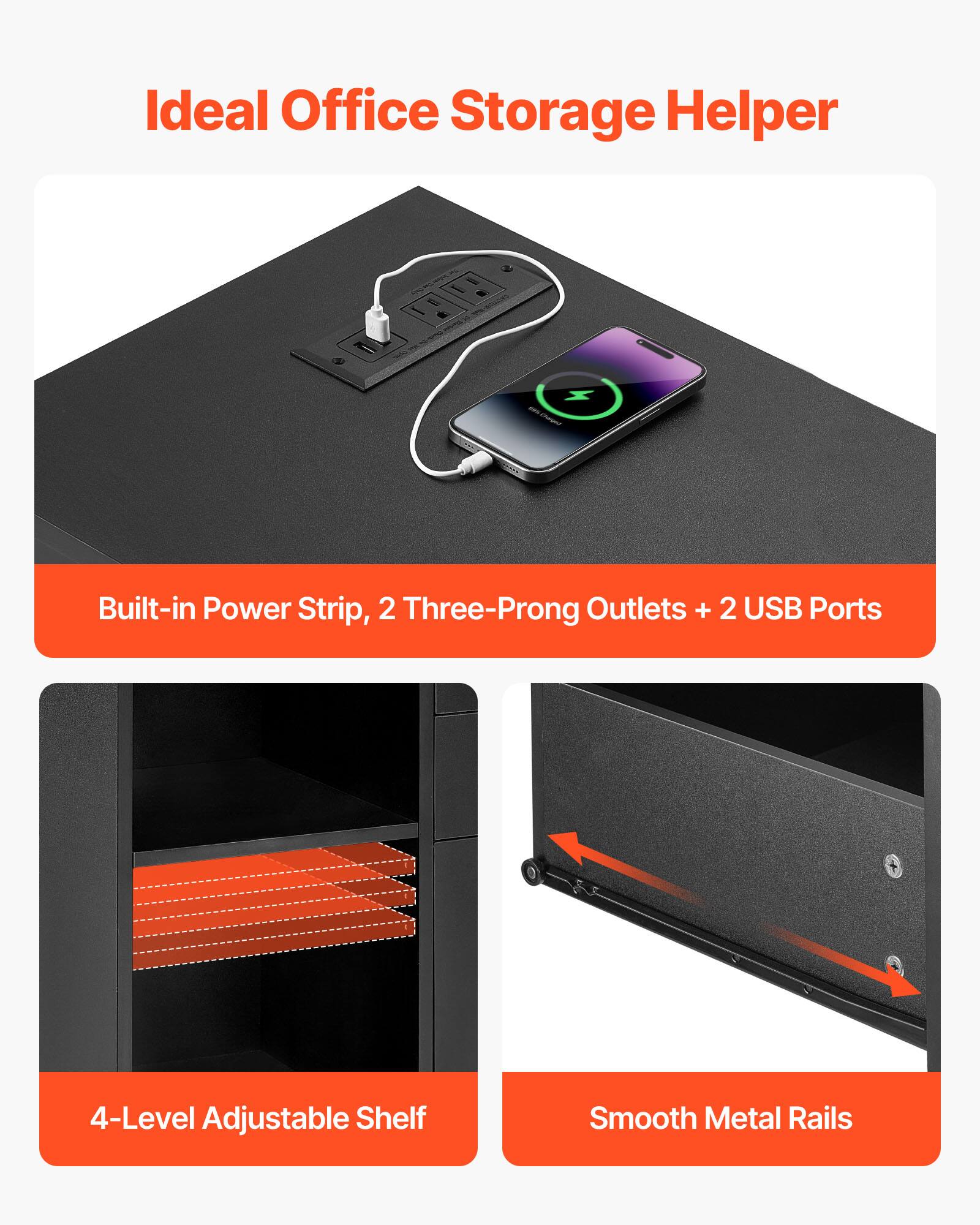 only the top drawer locks, wish all 3 of the cabinets or at least the filing cabinet locked. also wish the power cord had a pre made cut out hole on the back for better cable management. otherwise nice decorative filing cabinet for storage.