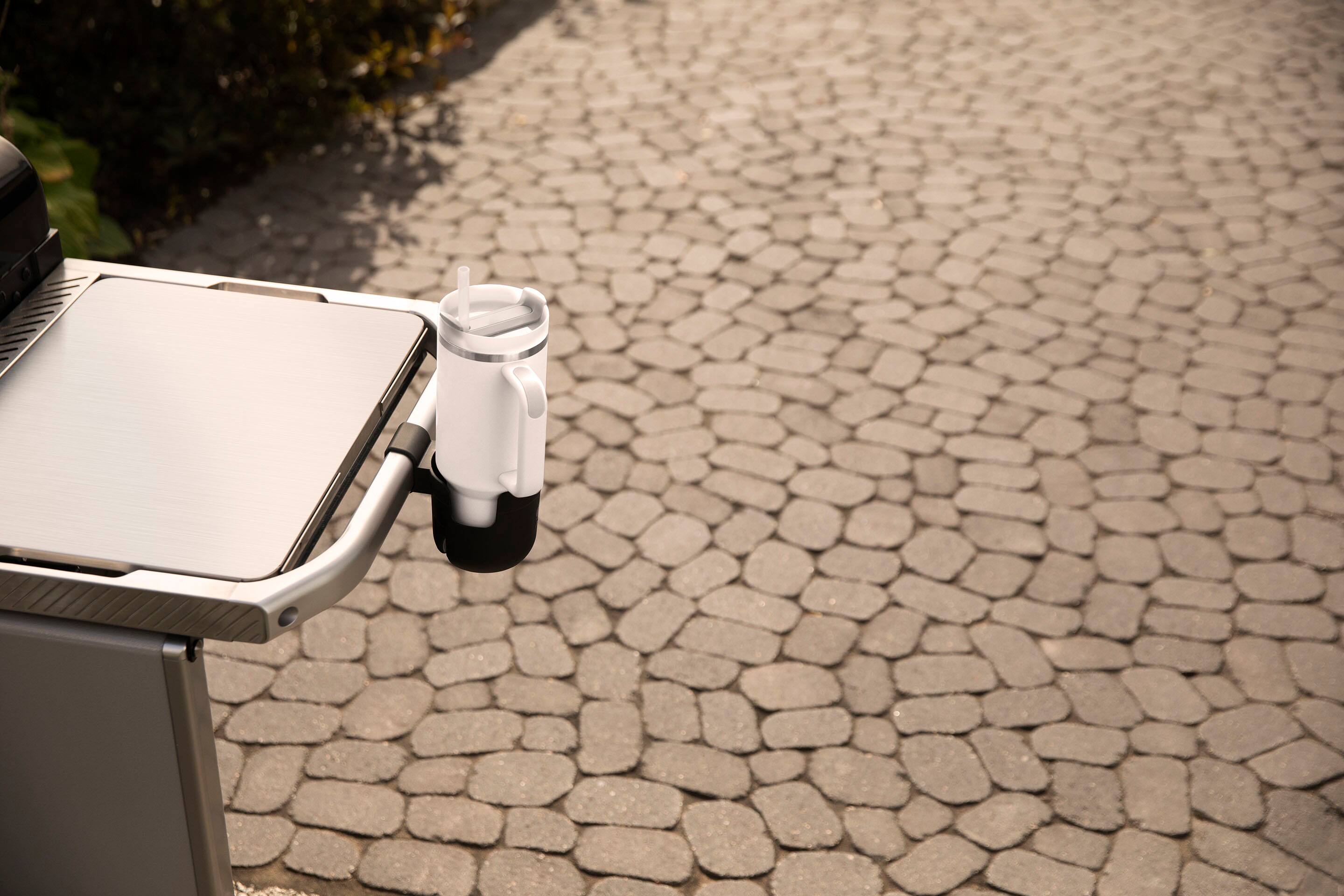 Clips on easily to my Weber Spirit EP 425 Stealth. Keeps my drink away from the heat and is also a good spot to leave my can of non-stick grill spray