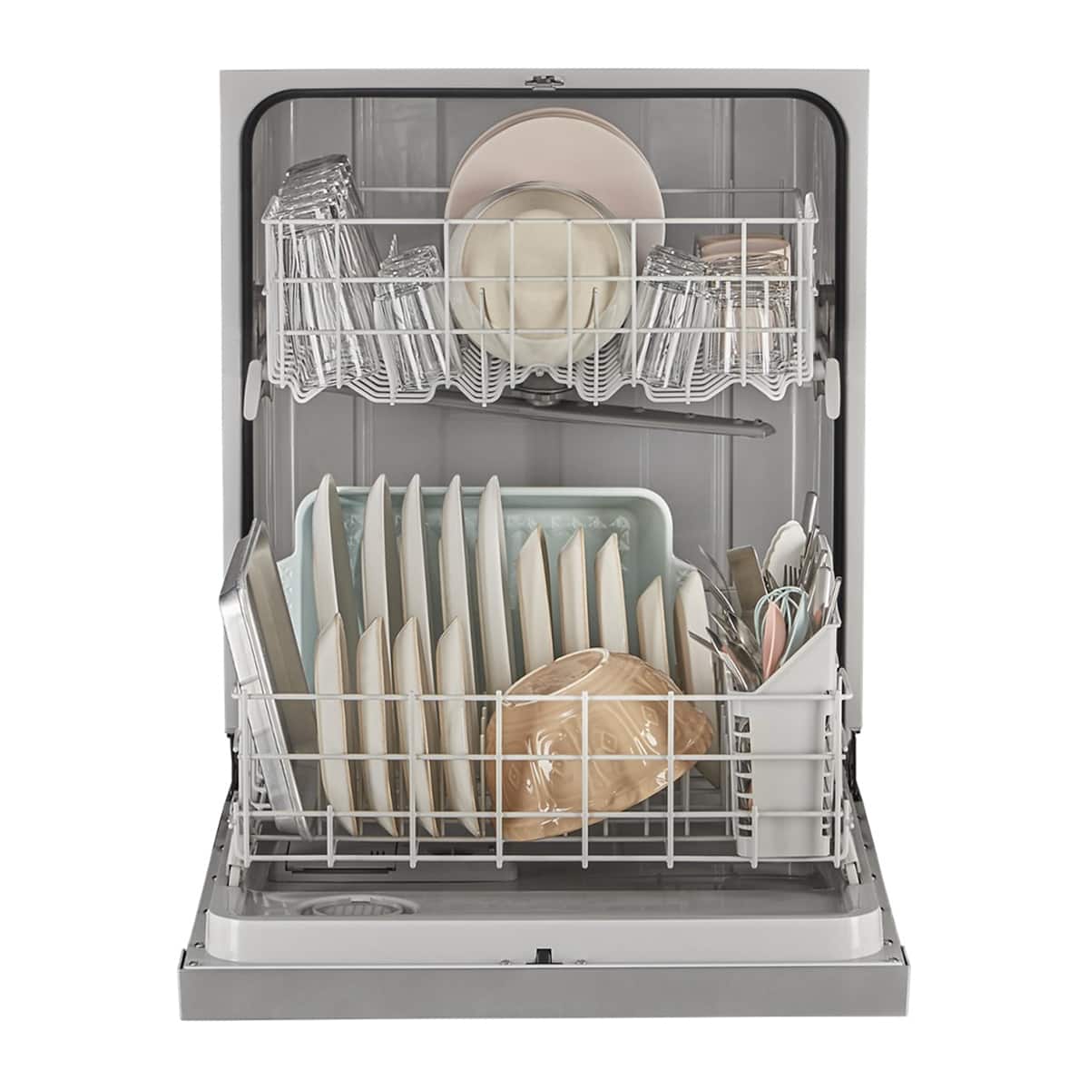 This Whirlpool 24 inch front control dishwasher has been solid so far. It is not the quietest unit out there at 57 dBA, but the sound is more of a soft hum than anything harsh. The Boost Cycle helps when dishes are extra messy, and the stainless steel finish looks clean in the kitchen. It loads easily, runs without drama, and leaves everything looking good. Nothing fancy, just a dependable everyday dishwasher.