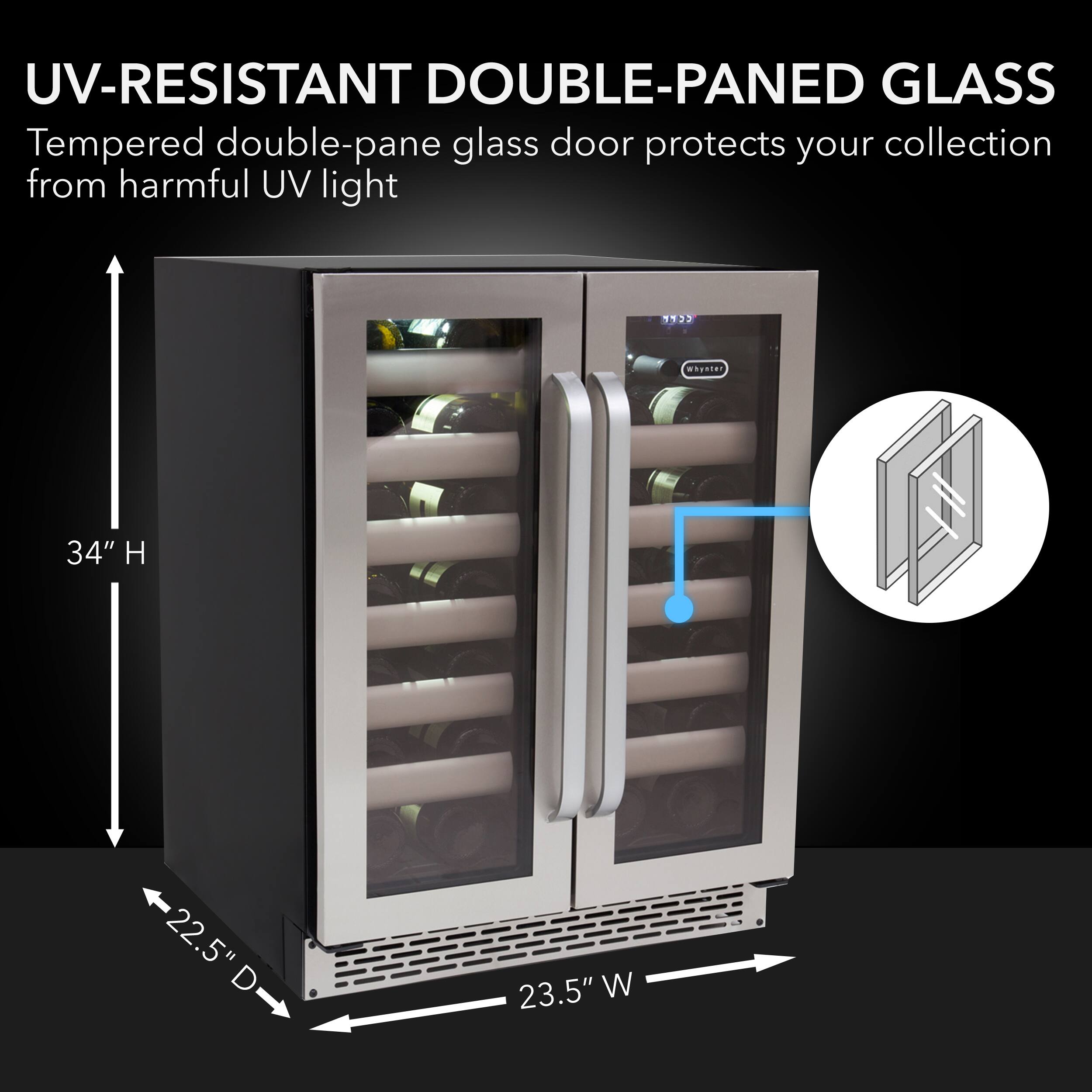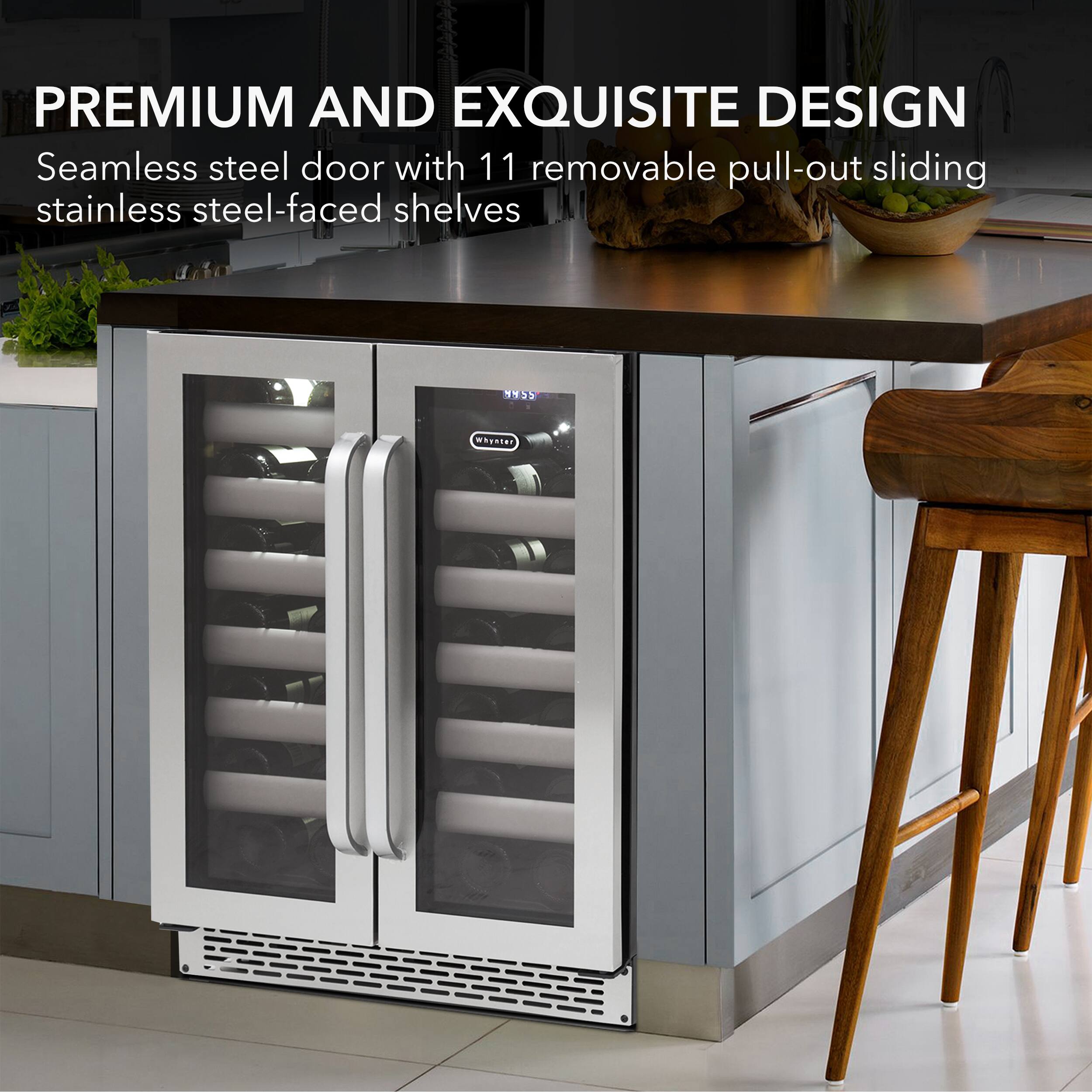 Beautiful looking French Door style wine cooler. Quiet compressor. Dual zone temperature for whites and reds with independent zones (left and right). Unlike my old 2 zone wine cooler, Both sides can be red or both sides white, or mixed left or right white or red. Lots of versatility. Control are hidden inside, so no accidental changes or power offs due to kids or cleaning ladies. Hopefully it lasts longer than the 4 years my older wine cooler did. Bought extended warranty just in case.