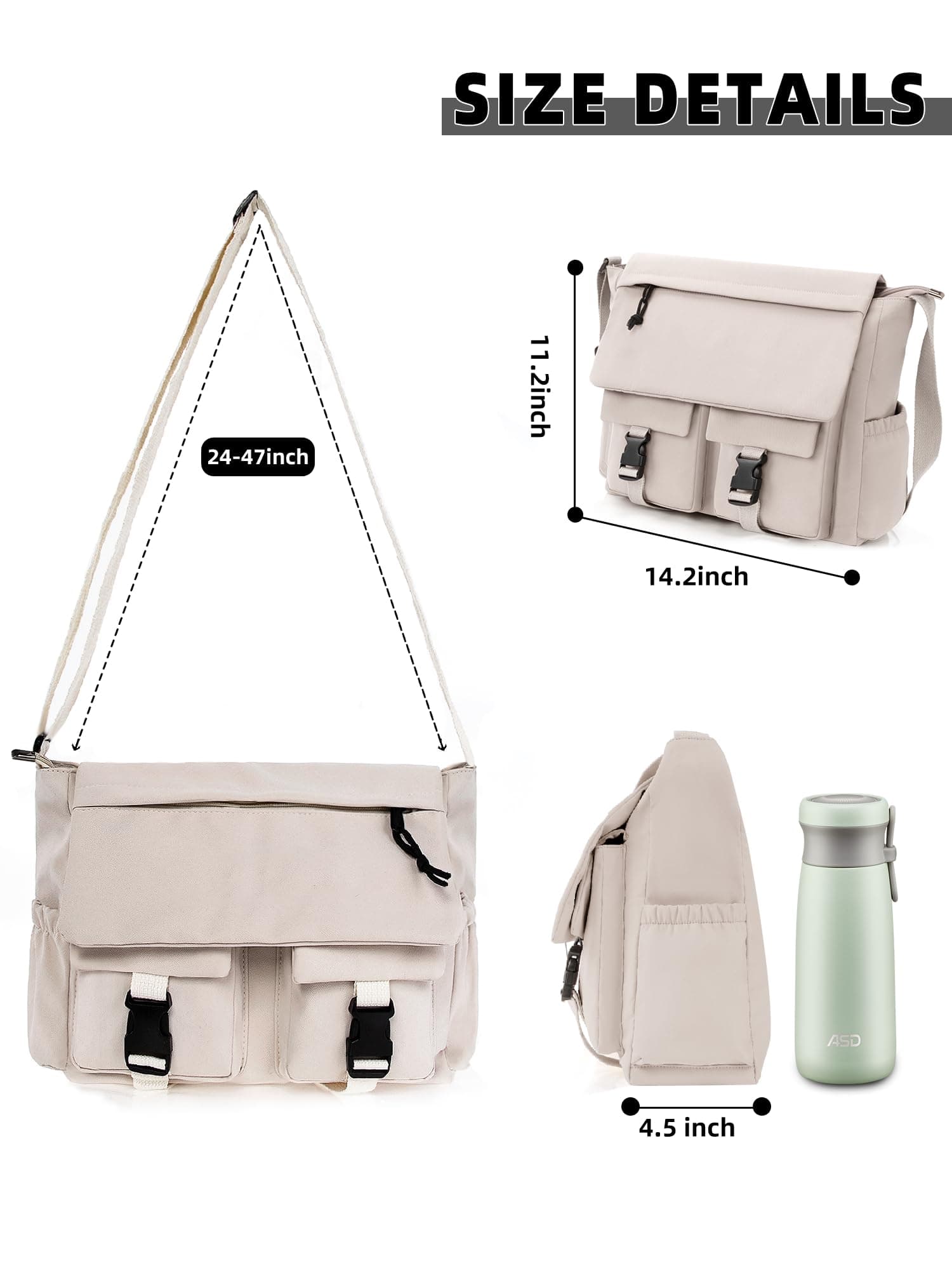 The messenger bag is a bit small, but the measurements are clearly stated in the description. I ended up returning the item because the material is very thin. Similar to a parachute material or breathable jogger. Unless the bag is full, there is no way it stands or retains its shape. In my opinion, not worth the price even when on sale. However, if you want a bag you can easily fold and pack into your pocket, purse, or suitcase, then this is the bag for that.