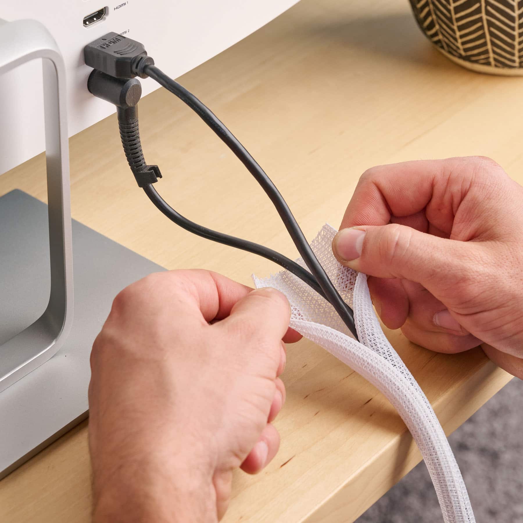 When you have a bunch of wires laying on the floor and a white baseboard on the wall, it's nice to wrap them all in the white sleeve which blends in with the baseboard. A great way to hide messy wires.