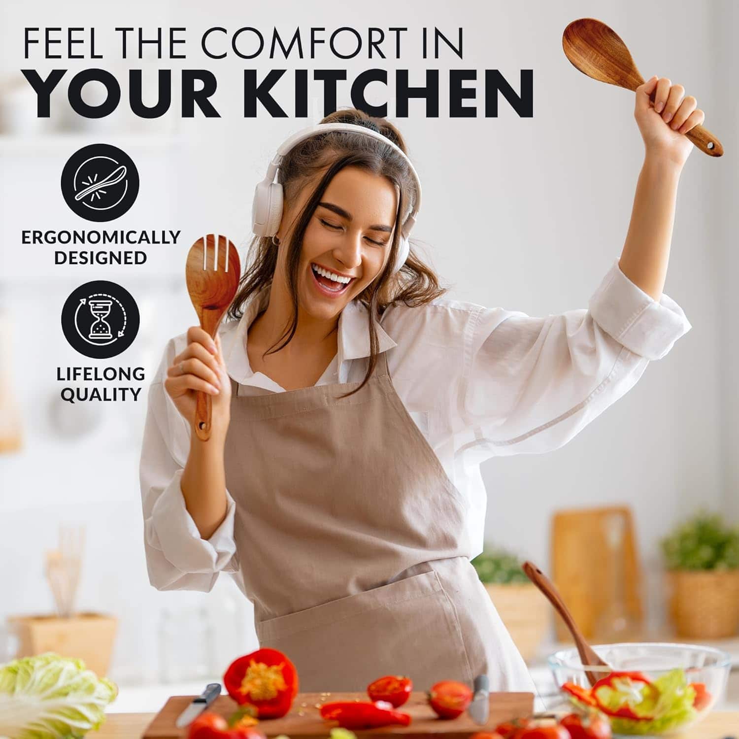 Nice set: sturdy and heavy, and with every utensil imaginable. One of the utensils came chipped, and the spoon-holder is oddly mismatched (it’s a different shade from the other items, almost like it’s a different wood). But mostly happy with them.
