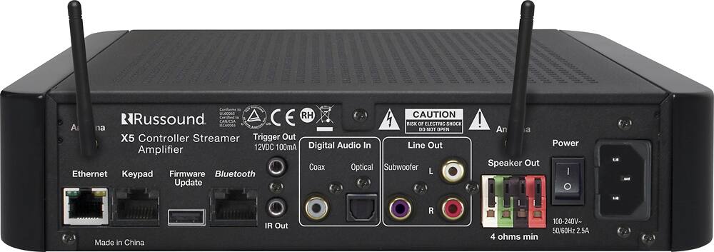 Russound X5 Controller Streamer Amplifier: Stay entertained with the X5, which functions as a controller, a streamer and an amplifier to provide the flexibility you need. The X5 is Bluetooth-ready, so you can pair with your mobile devices. You can connect to your network with the Ethernet port and hook up your audio equipment with the speaker outputs and L/R and subwoofer line outputs.