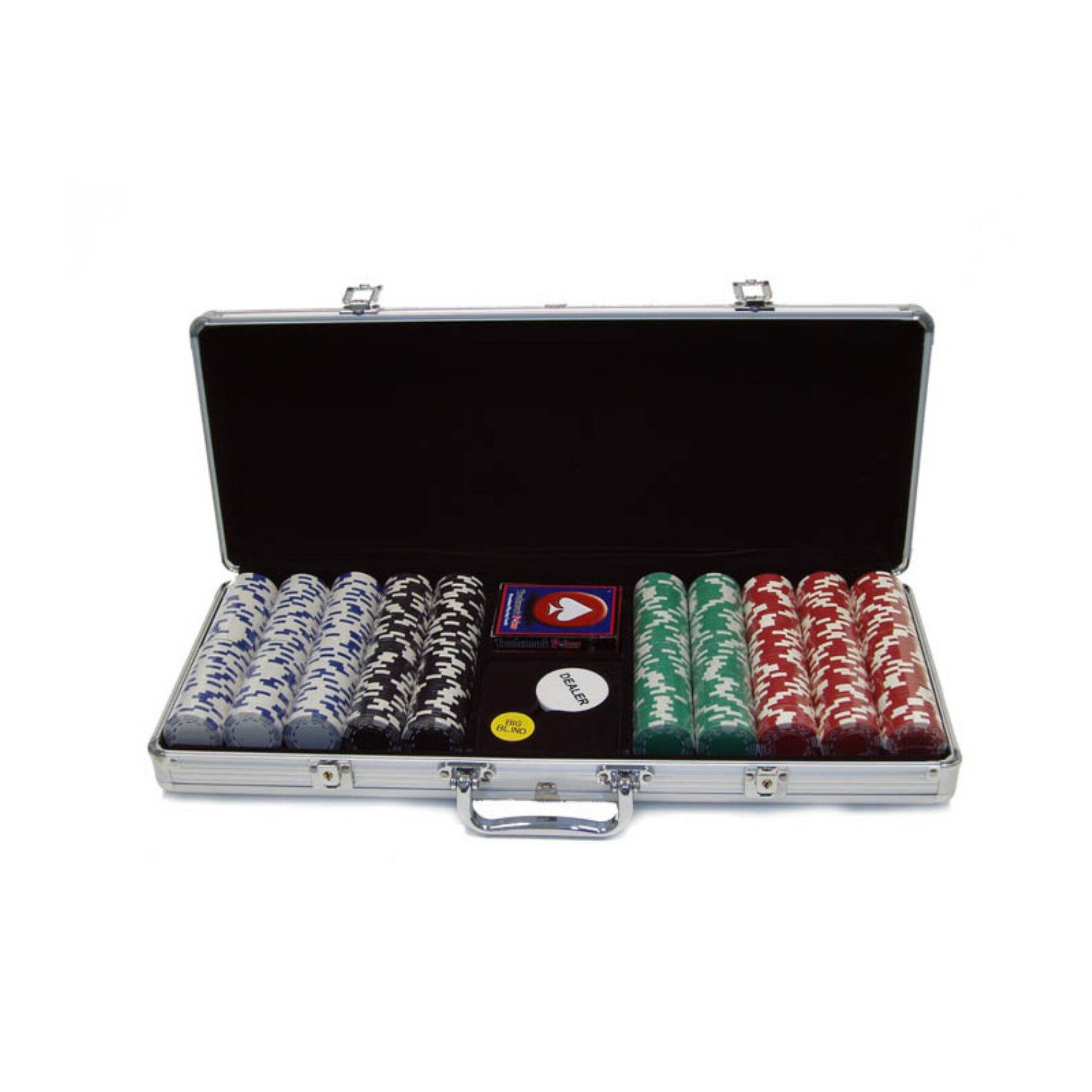 Setting up for poker night is as easy as calling a few friends, filling a couple of bowls with chips, and cracking open the Trademark Poker 11.5g Royal Suited Chips with Aluminum Case. This complete set includes 300 or 500 39mm chips, each crafted with 11.5g composite resin and a weighted insert for true casino quality. Four colors - red, white, green, and black - are dressed with bold stripes and card suits, perfectly on point with the included five dice and two decks of cards. All the pieces fit securely in dedicated spaces inside the included heavy-duty silver aluminum carrying case, softly lined with plush green felt. 300-piece Set Includes:100 white chips100 red chips50 green chips50 black chips5 dice2 decks of cardsAluminum carrying case 500-piece Set Includes:150 white chips150 red chips100 blue chips100 green chipsDeck of cardsDealer, Big Blind, and Little Blind buttonAluminum carrying case About Trademark Global Inc. Located in Lorain, Ohio, Trademark Global offers a vast selection of items for your home and lifestyle. Whether you need automotive products, collectibles, electronics, general merchandise, home and garden items, home decor, house wares, outdoor supplies, sporting goods, tools, or toys, Trademark Global has it at a price you can afford. Decor items and so much more are the hallmark of this company. 11.5g composite resin with weighted insert300 chips in 4 colorsGraphic design with stripes and suitsIncludes 5 dice and 2 decks of cardsSturdy lined aluminum carrying case