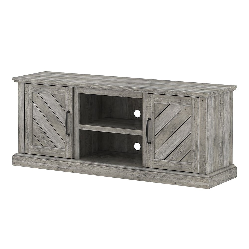 This TV stand for TVs up to 60 inches and 50 pounds features a rustic finish and head-turning detail for the perfect upgrade to your entertainment space. With plenty of storage for AV components, decorative accents, or must-haves for game night, it is an ideal piece for your living room, den, game room, and more. The open center compartment is perfect for display or holding your cable box or gaming console, while the side cabinets offer concealed storage with adjustable shelves. The cabinets feature framed, diagonally planked doors. Cutouts in the TV stand’s back panel route and hide unsightly cables to keep your entertainment space clean and organized.