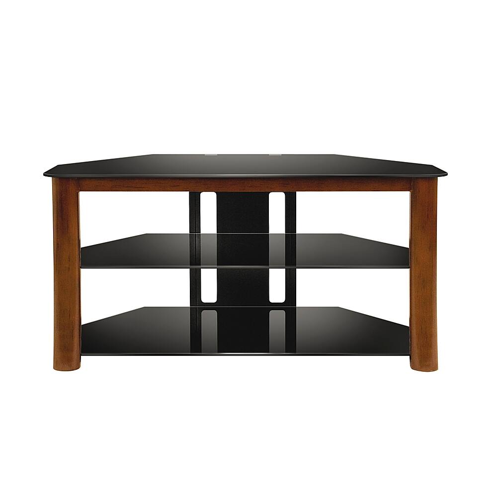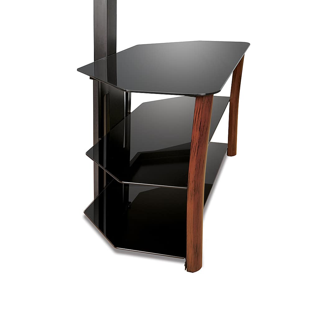 Attractive and sturdy furniture. Have a 55” LED TV on it. Hard to find stands suitable for use in a corner. Constructed of dark brown finished metal with black glass. Was easy to assemble using one Allen wrench (not included). The unit bolts together, holes line up perfectly. I have the TV sitting on top of the stand but the stand comes with hardware to hang the TV above the stand either on the wall or an included rectangular post. This is a quality unit.