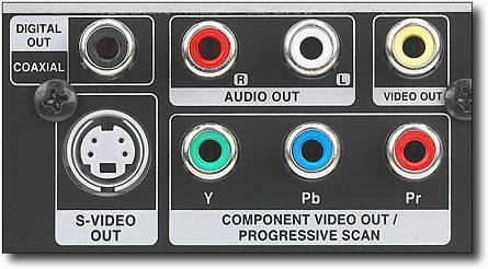 Composite video output, S-video output, component video output, stereo audio outputs and coaxial audio output